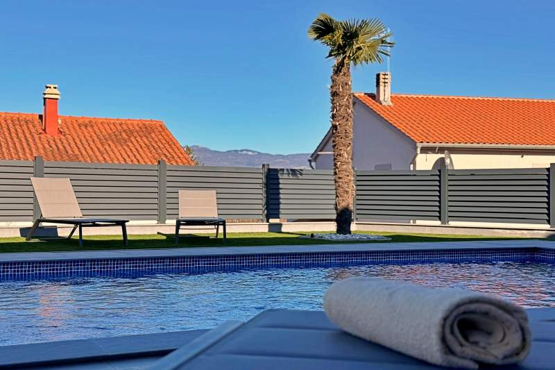 Die moderne Villa im ruhigen Donja Hlapa auf Krk bietet Platz für 8 Gäste. 4 Schlafzimmer mit eigenen Bädern, heller Wohnbereich mit Küche, WLAN und Klimaanlage. Außen erwarten Sie Pool, Whirlpool, Terrasse mit Grill, Balkonzugang, Waschmaschine und Parkplatz direkt vor dem Haus.