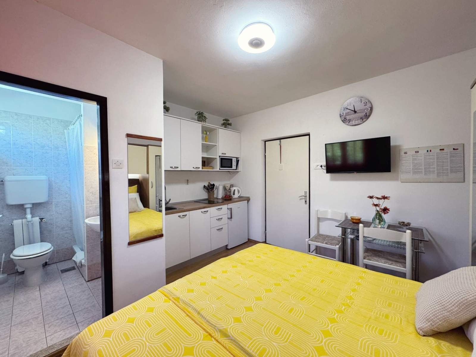 Vrlo ljubazni domaćini, uvijek nam dostupni, svaka 3 dana potpuno svježi ručnici, nakon tjedan dana svježa posteljina, udoban tapecirani krevet, prekrasan pogled s male terase, mala soba s kuhinjskom nišom i svime što vam treba, besplatno parkiranje u hladu na posjedu.