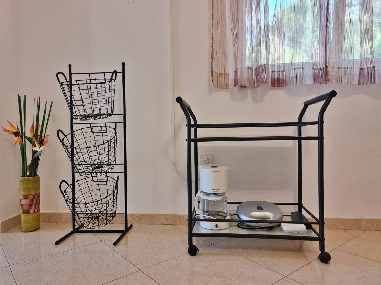 Das Apartment verfügt über ein Schlafzimmer mit einem Doppelbett und ein Badezimmer mit Dusche, WC und Haartrockner. Das Wohnzimmer verfügt über Sat-TV, ein Schlafsofa für einen zusätzlichen Gast, einen Kleiderschrank und ein weiteres Einzelbett. Die gut ausgestattete Küche umfasst einen Elektroherd, einen Backofen, einen Kühl- und Gefrierschrank, eine Kaffeemaschine, einen Wasserkocher, eine Mikrowelle, einen Toaster und einen Geschirrspüler. Eine zusätzliche Toilette und ein Waschraum befinden sich praktischerweise neben der Terrasse. Genießen Sie den Komfort des im Preis inbegriffenen WLANs und der Klimaanlage für einen angenehmen Aufenthalt.