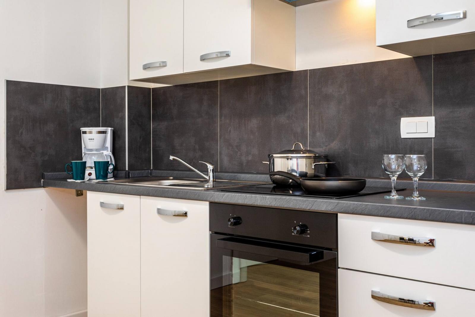 Es hat 1 Schlafzimmer (mit einem Doppelbett), eine voll ausgestattete Küche mit Wohnzimmer (zusätzliches Bett auf der Couch für zwei Personen), ein Badezimmer (Dusche, WC) und eine Terasse (10 m2).