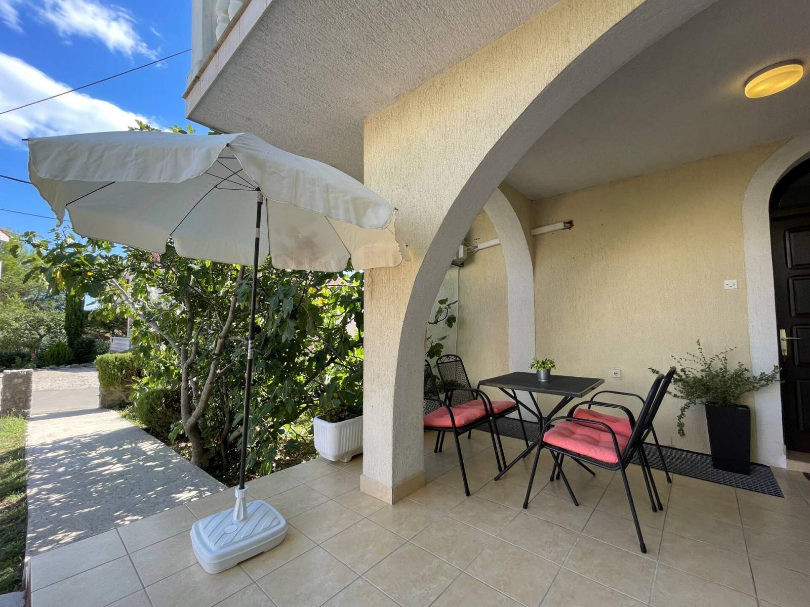 Draußen lädt eine große, überdachte Terrasse – gemeinsam mit der Nachbarwohnung – mit eigenen Gartenmöbeln und Sonnenschirm zum Entspannen ein. Zudem gibt es noch eine weitere, von Grün umgebene Terrasse, die durch das Wohnzimmer und das Schlafzimmer zugänglich ist. Ein gemeinsamer Grillplatz befindet sich praktischerweise neben der Terrasse. Haustiere sind gegen Aufpreis willkommen und ein Babybett ist auf Anfrage erhältlich (je nach Verfügbarkeit). Direkt vor der Terrasse stehen ausreichend Parkplätze zur Verfügung.