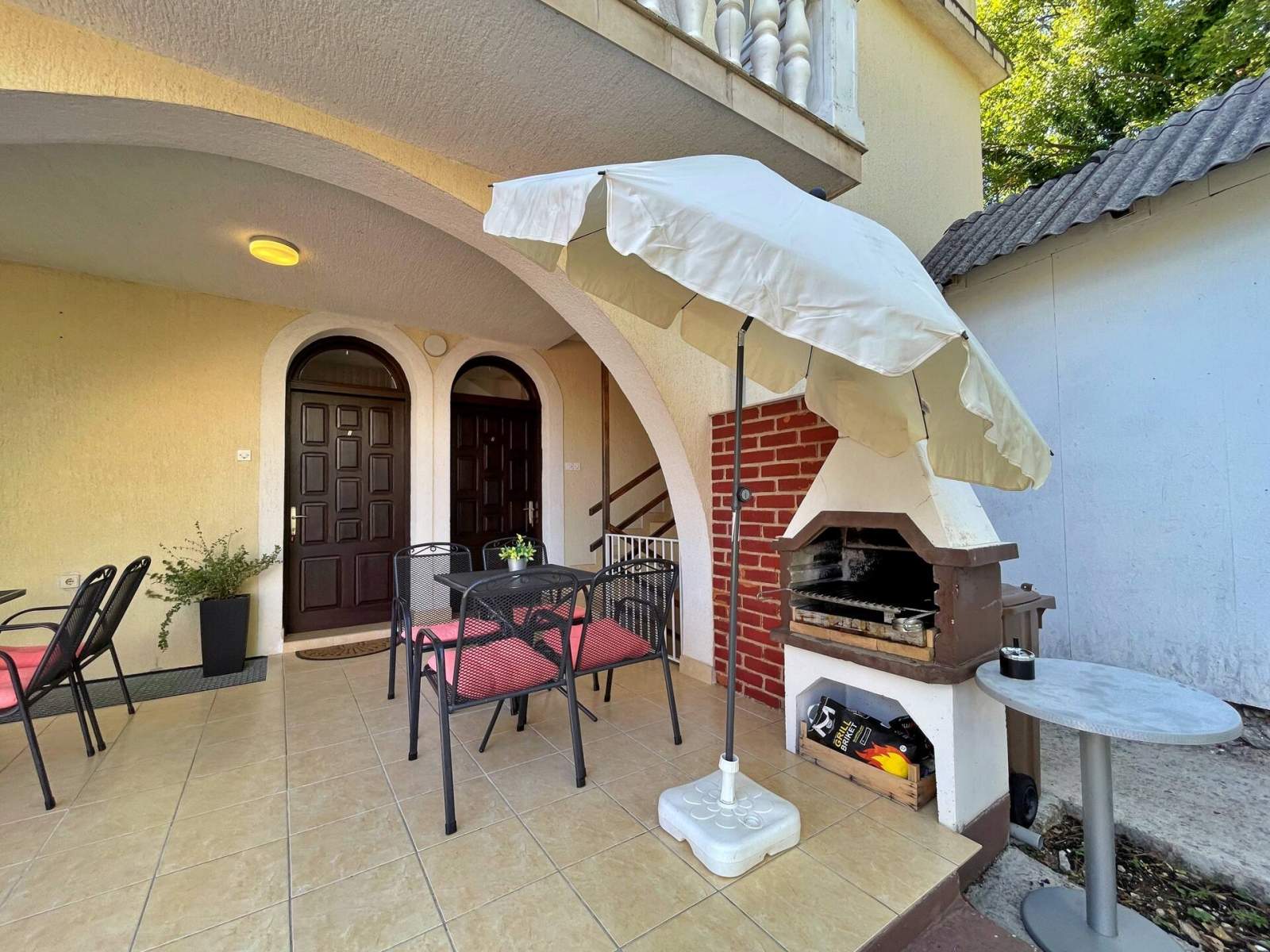 Draußen lädt eine große, überdachte Terrasse – gemeinsam mit der Nachbarwohnung – mit eigenen Gartenmöbeln und Sonnenschirm zum Entspannen ein. Ein gemeinsamer Grillplatz befindet sich praktischerweise neben der Terrasse. Haustiere sind gegen Aufpreis willkommen und ein Babybett ist auf Anfrage erhältlich (je nach Verfügbarkeit). Direkt vor der Terrasse stehen ausreichend Parkplätze zur Verfügung.