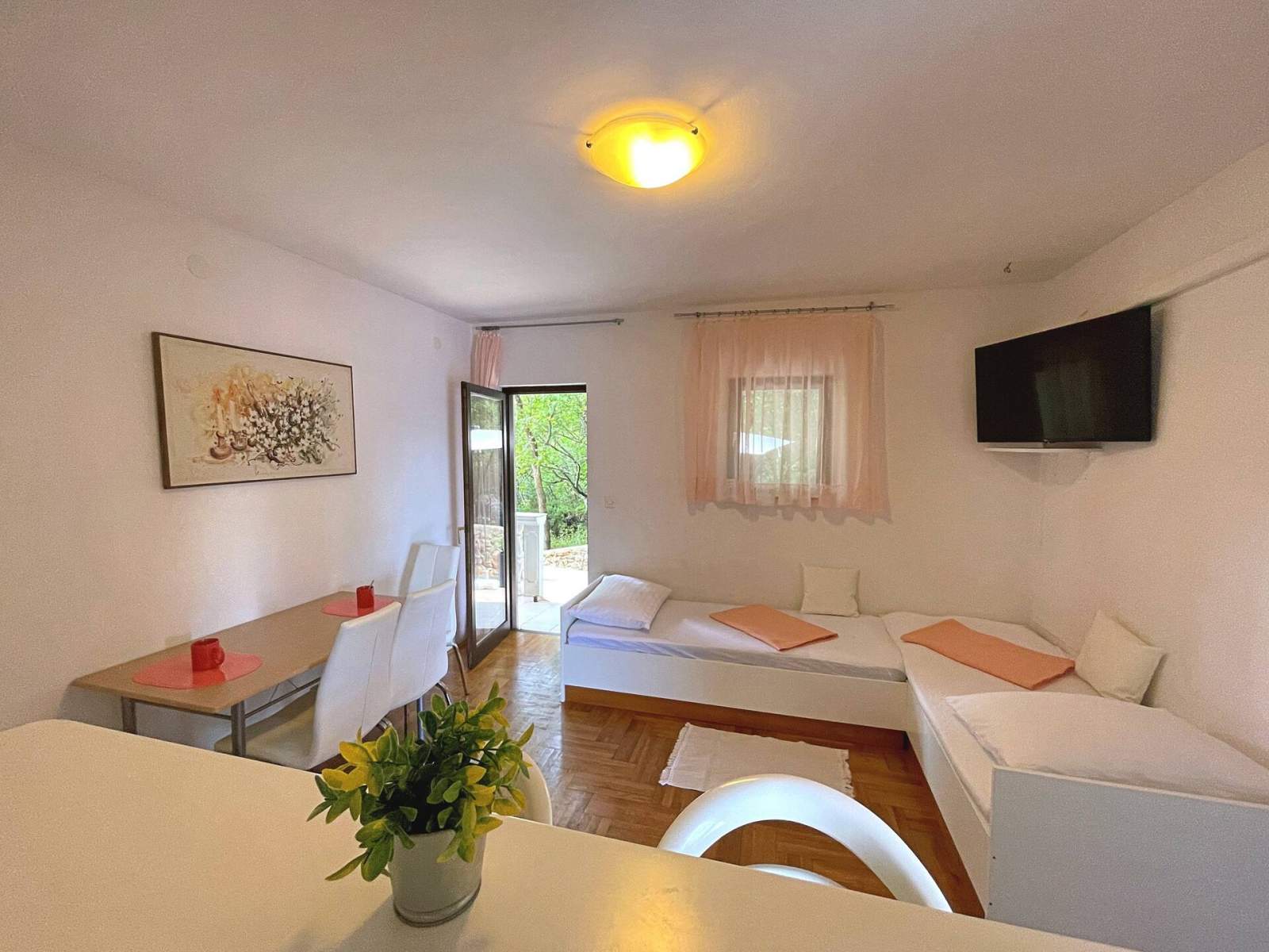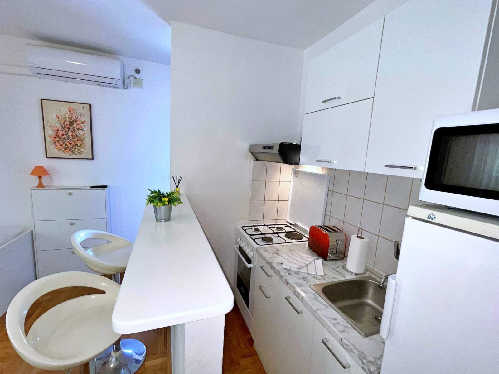 Dieses gemütliche Apartment mit einem Schlafzimmer, 500 m vom Meer entfernt, befindet sich im Erdgeschoss und verfügt über ein Doppelbett mit direktem Zugang zu einem privaten Balkon mit Blick auf eine ruhige Straße. Das Badezimmer verfügt über eine Toilette, eine Dusche und einen Haartrockner. Im Wohnzimmer finden Sie einen Essbereich mit Esstisch, Sat-/Kabel-TV, Klimaanlage und zwei Einzelbetten. Die kompakte Küche im Wohnbereich ist mit einem Elektro-/Gasherd, Backofen, Wasserkocher, Kaffeemaschine, Toaster, Mikrowelle und Kühlschrank mit Gefrierfach ausgestattet.