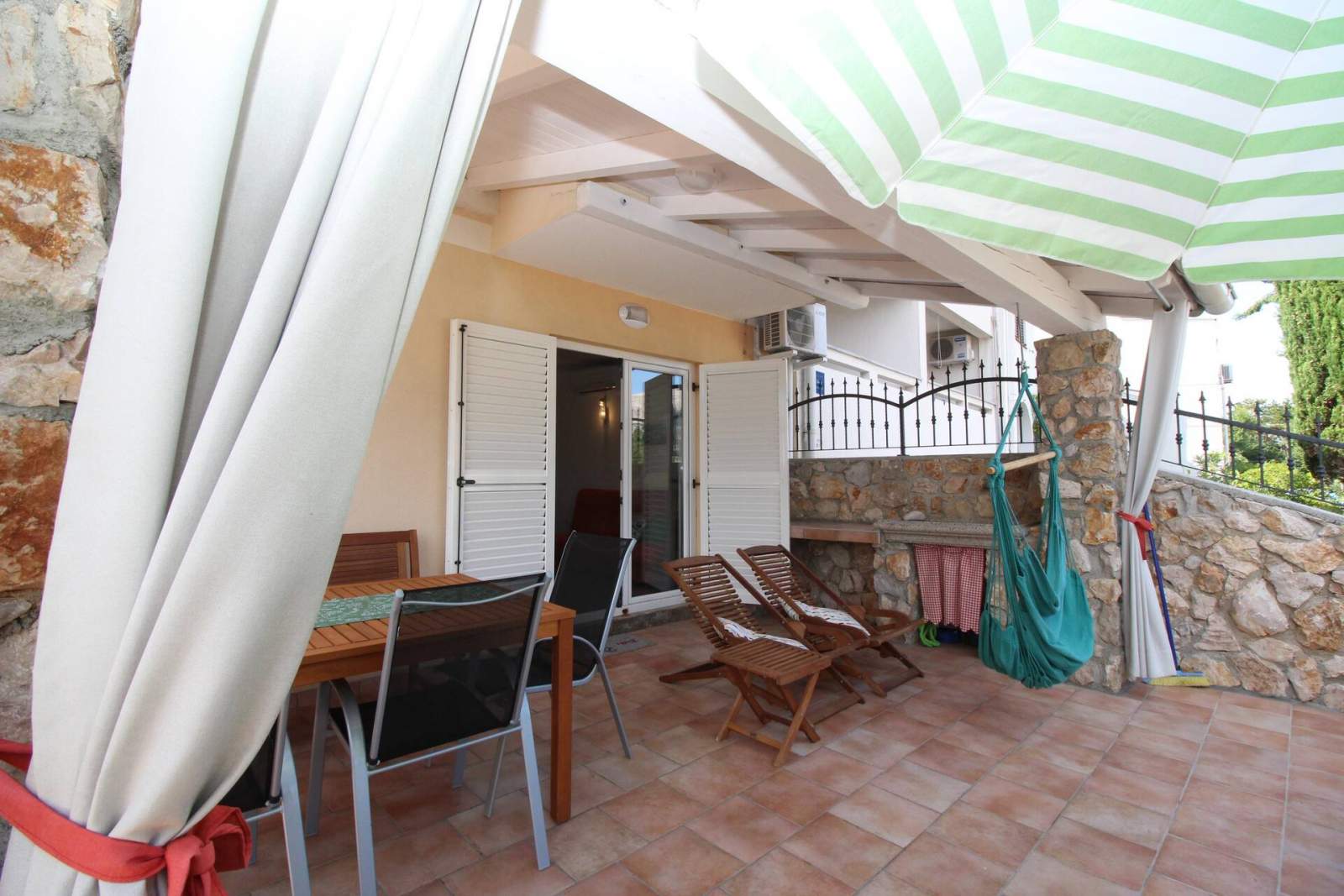 Es hat 2 Schlafzimmer, eine voll ausgestattete Küche mit Wohnzimmer (zusätzliches Bett auf der Couch), ein Badezimmer (Dusche, WC, Waschmachine) und eine große überdachte Terrasse mit Gartenmöbeln (15 m2).