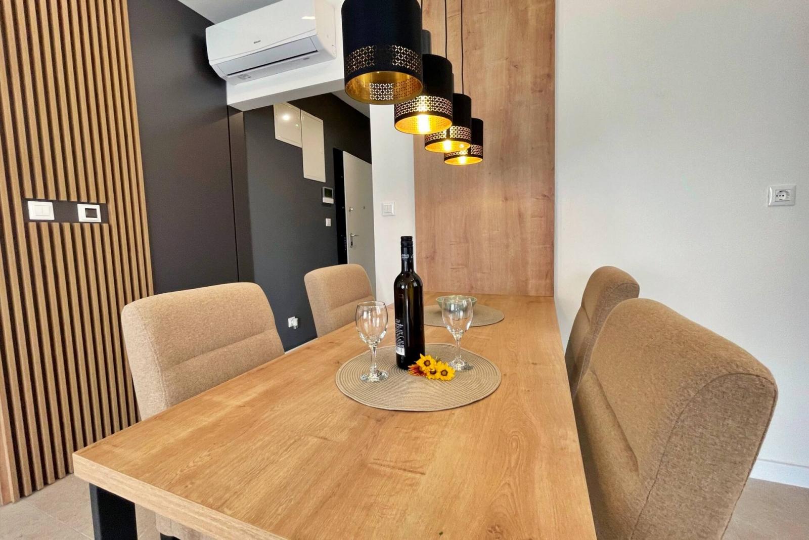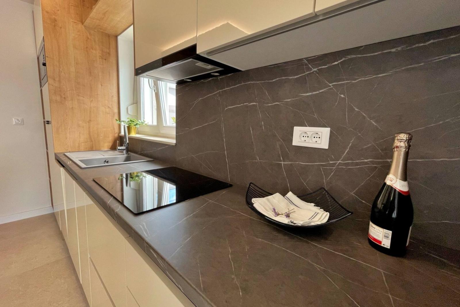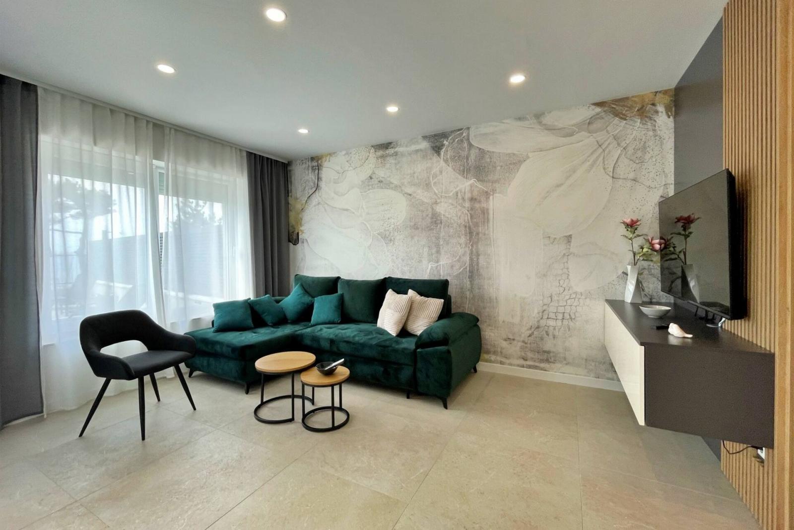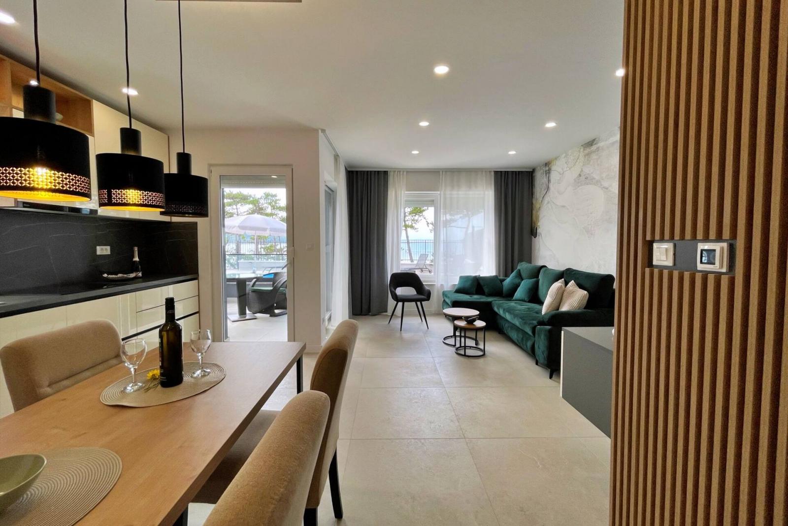 Dieses luxuriöse und moderne Apartment befindet sich in einem ruhigen Apartmentkomplex nur 30 Meter vom Meer entfernt, umgeben von Natur, vielen Buchten, Kieselstränden und Wanderwegen. Es bietet einen gemeinschaftlichen Salzwasserpool (36 m2), der von Mai bis Oktober geöffnet ist und dessen Temperaturen normalerweise 20-26 °C erreichen. Das Apartment befindet sich im Erdgeschoss und verfügt über ein Schlafzimmer mit einem Doppelbett, eine moderne Küche mit Induktionskochfeld, Kühl- und Gefrierschrank, Wasserkocher, Kaffeemaschine, Toaster, Mikrowelle und Geschirrspüler. Das Badezimmer verfügt über eine Dusche und eine Toilette. Der Essbereich und das Wohnzimmer bieten einen gemütlichen Raum mit einem Sofa und einem Smart-TV, während kostenloses WLAN im gesamten Gebäude verfügbar ist.