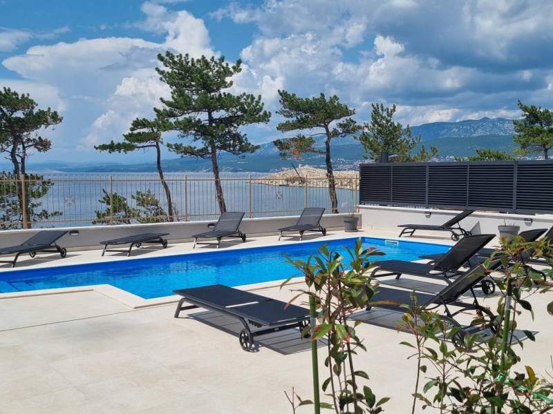 Die Terrasse (16 m2) bietet direkten Zugang zum Poolbereich und eine wunderschöne Aussicht auf den Pool und das Meer. Der Poolbereich ist mit Sonnenliegen, Sonnenschirmen und einer Außendusche ausgestattet und bietet direkten Zugang zum Meer zum bequemen Schwimmen. Ein gemeinsamer Waschraum im Erdgeschoss umfasst eine Waschmaschine, Waschkapseln/Waschmittel und ein Bügeleisen zur Nutzung durch die Gäste.