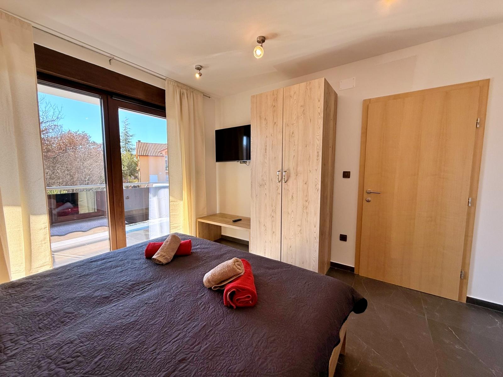 Die Villa erstreckt sich über zwei Etagen. Im Erdgeschoss befinden sich ein heller, offen gestalteter Wohnbereich mit voll ausgestatteter Küche und Essbereich mit direktem Zugang zur Terrasse, ein Badezimmer mit Waschmaschine sowie ein Schlafzimmer mit eigenem Bad. Im Obergeschoss gibt es drei Schlafzimmer, jeweils mit eigenem Bad, TV und Zugang zum Balkon.