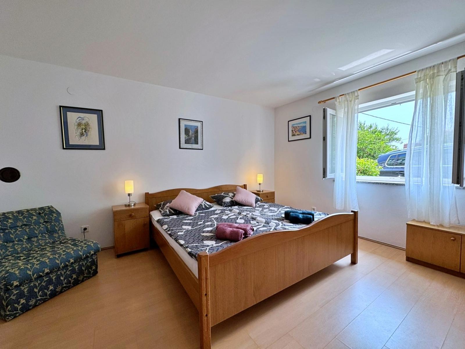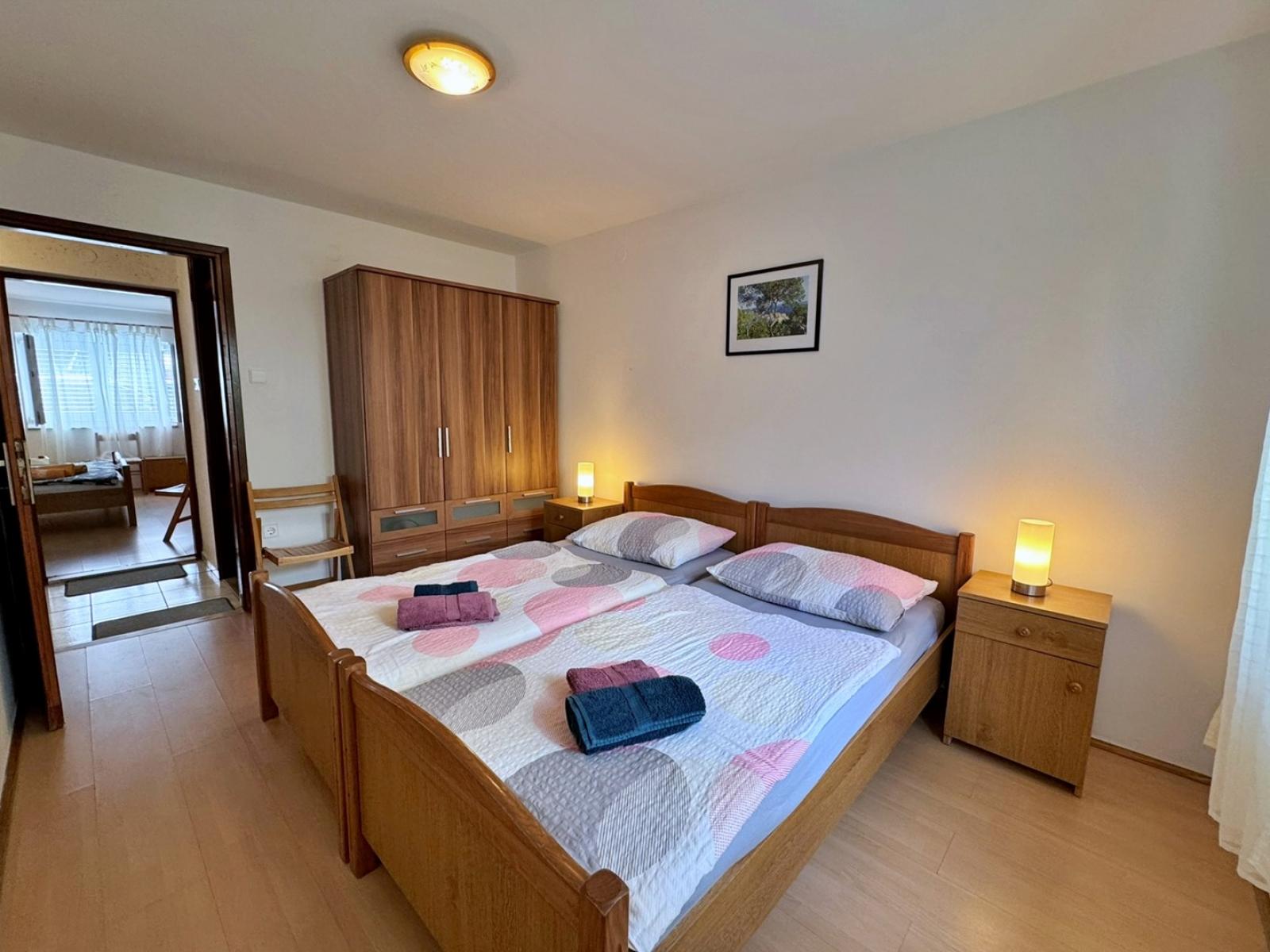 Dieses Apartment im Erdgeschoss, nur 500 m vom Meer und dem Stadtzentrum entfernt, bietet einen komfortablen Aufenthalt mit zwei Schlafzimmern, jedes mit einem Doppelbett. Das Wohnzimmer verfügt über einen Esstisch, Satellitenfernsehen und eine Klimaanlage. Die voll ausgestattete Küche verfügt über einen 4-Flammen-Induktionsherd, einen Backofen, einen Kühlschrank mit Gefrierfach, eine Kaffeemaschine, einen Wasserkocher, einen Toaster und einen Geschirrspüler. Draußen können Sie auf der 20 m2 großen überdachten Terrasse mit Gartenblick entspannen, die Sie mit der Nachbarwohnung teilen. Zu den weiteren Annehmlichkeiten gehören ein gemeinsamer Grill, kostenlose Parkplätze sowie Bettwäsche und Handtücher.