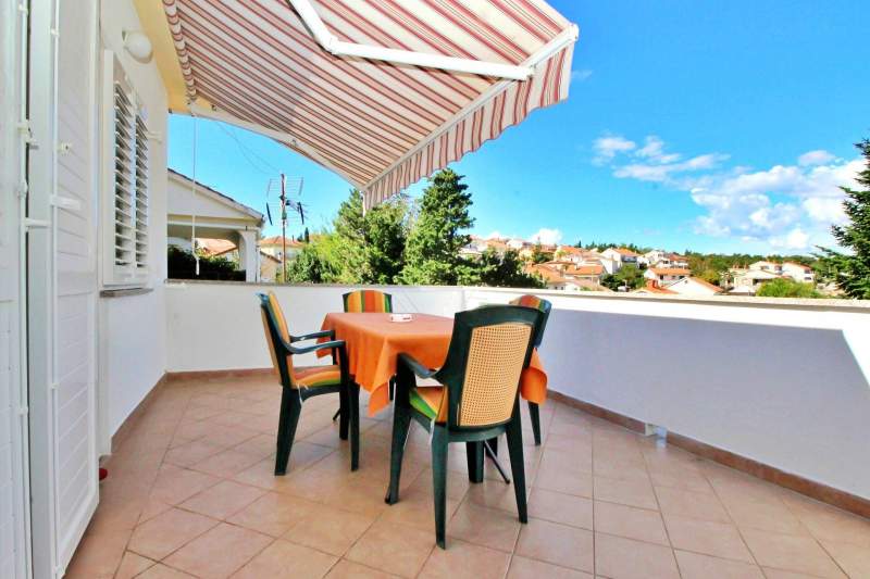 Enjoy your holiday in this spacious apartment for 4 guests in Šilo on island Krk, known for its beaches and hiking trails. It has two bedrooms with queen-size beds, a living room with a kitchen and dining area, and a bathroom with a shower and washing machine. The kitchen features an electric stove, oven, and fridge. Relax on the 20 m2 terrace with a sea view. Located 500 meters from the center, it offers air conditioning, Wi-Fi, free parking, and also welcomes pets for an extra charge.
