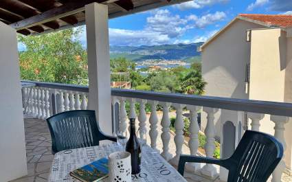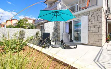 This luxury apartment with sea view is located in a building complex and in a peaceful area. The building has a large saltwater pool (40 m2) for all the guests in the house to use. On the ground floor of the building guests can rest on deckchairs next to the pool. The apartment is located on the ground floor and has a private parking behind the building. There is also a large pebble beach in the immediate vicinity, and a great restaurant, which also offers a selection of local specialties.