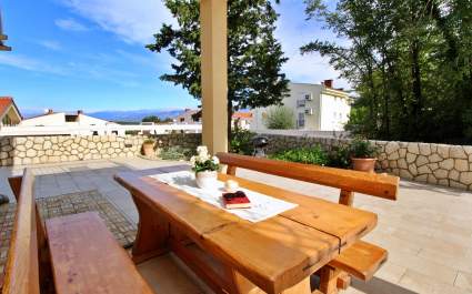 Spacious ground-floor apartment, 200 m from the sea, with two queen-bed bedrooms. The living area has a dining table, satellite TV, air conditioning, a pull-out couch, and access to a 30 m2 roofed terrace with garden views. The kitchen includes an electric stove, oven, fridge, microwave, dishwasher, coffee machine, and kettle. Bathroom with shower, free Wi-Fi, private parking, and a BBQ area ensure a relaxing stay.