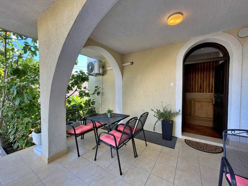 Outside, a spacious, roofed terrace — shared with the neighboring apartment — with its own outdoor furniture and a parasol for relaxation. A shared BBQ area is conveniently located beside the terrace. Pets are welcome for an additional fee, and a baby cot is available upon request (subject to availability). Ample parking space is available just in front of the terrace.