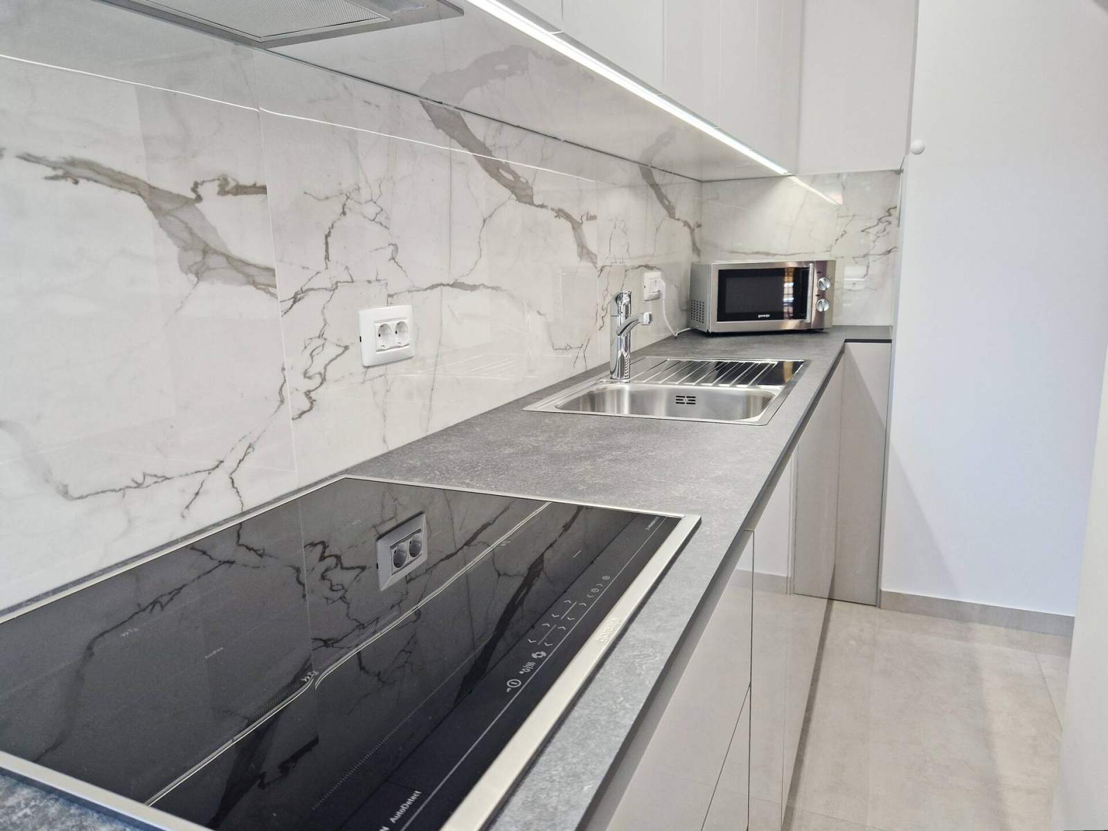 The apartment comes with a fully equipped kitchen with dining area and living room, a bathroom (shower, toilet) and a balcony (5 m2).