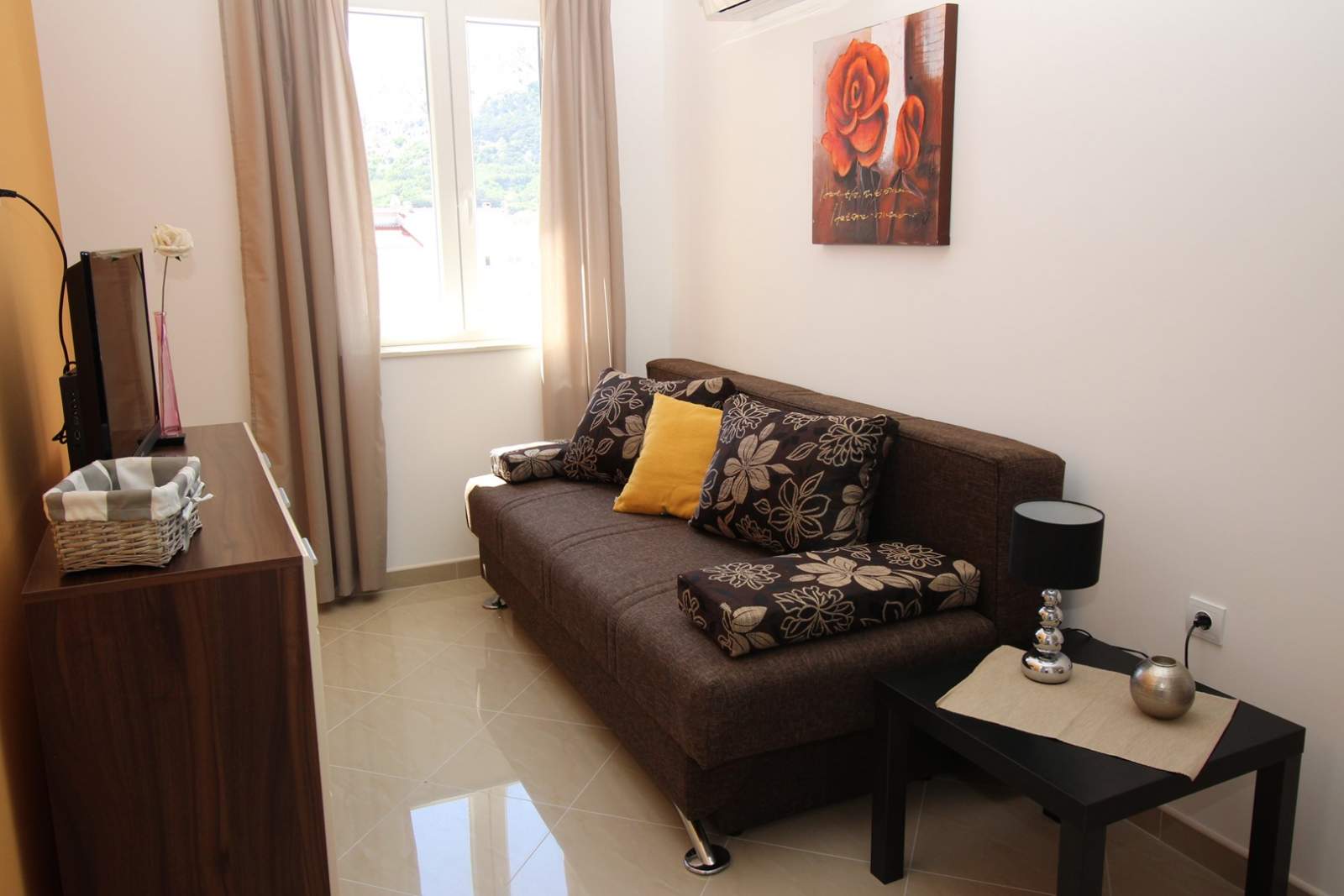 The apartment consists of one bedroom, a bathroom (shower, toilet, hair dryer, washing machine), a bright living area with air conditioning, SAT TV, free Wi-Fi and with fully equipped kitchen. The kitchen includes an electric stove, fridge with a freezer, dishwasher, microwave, coffee maker and kettle. Kitchen utensils are included.