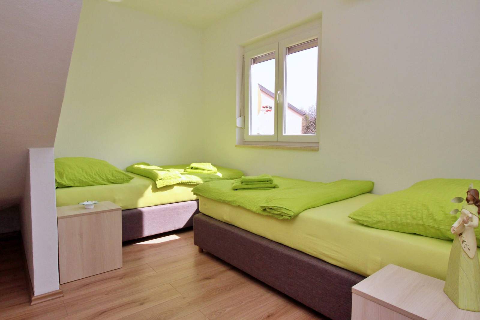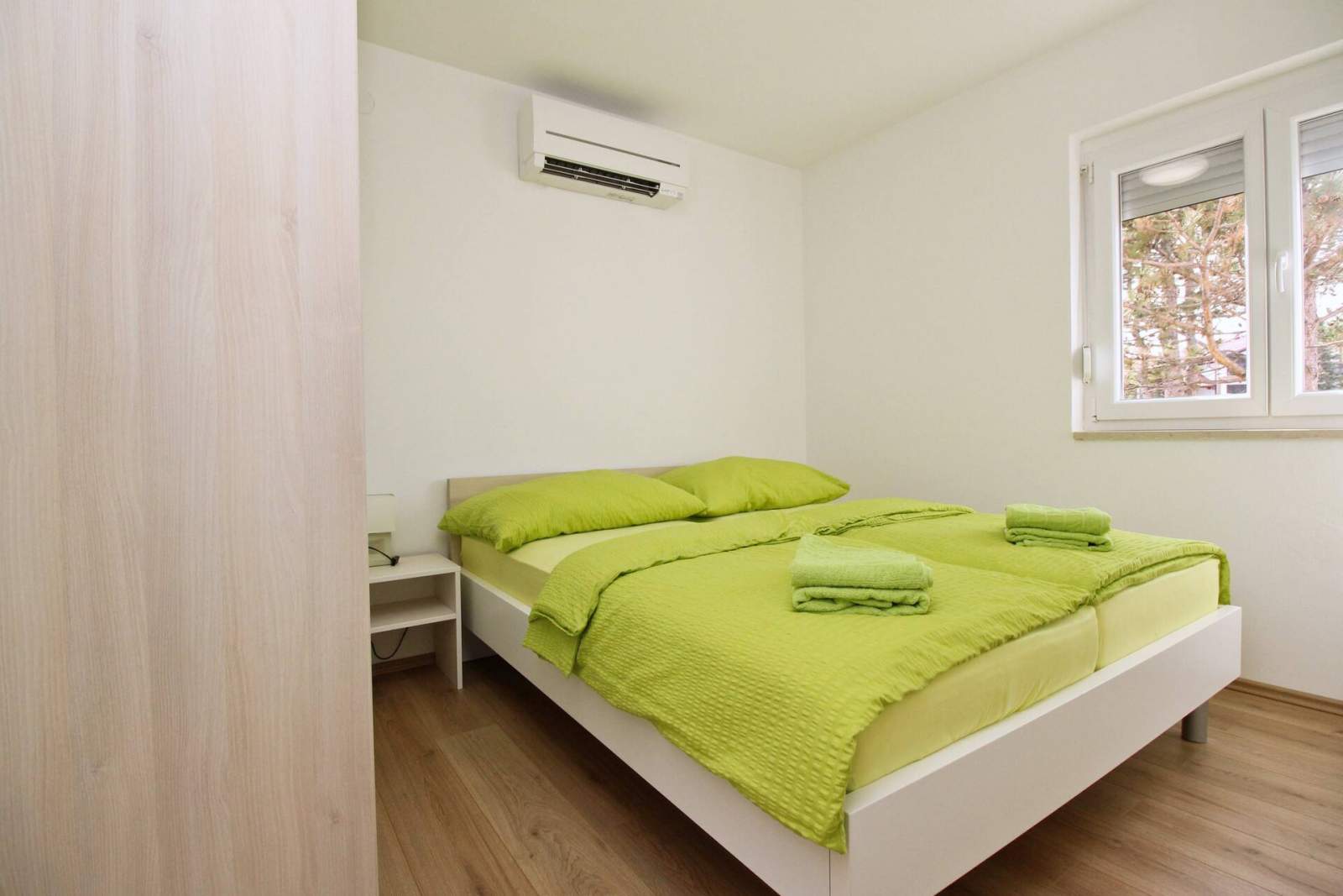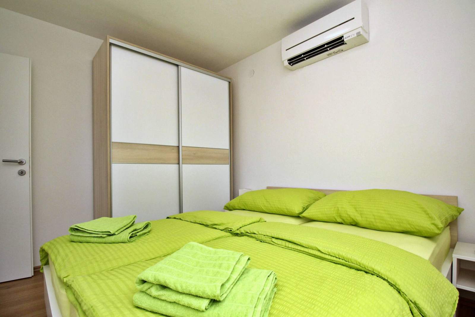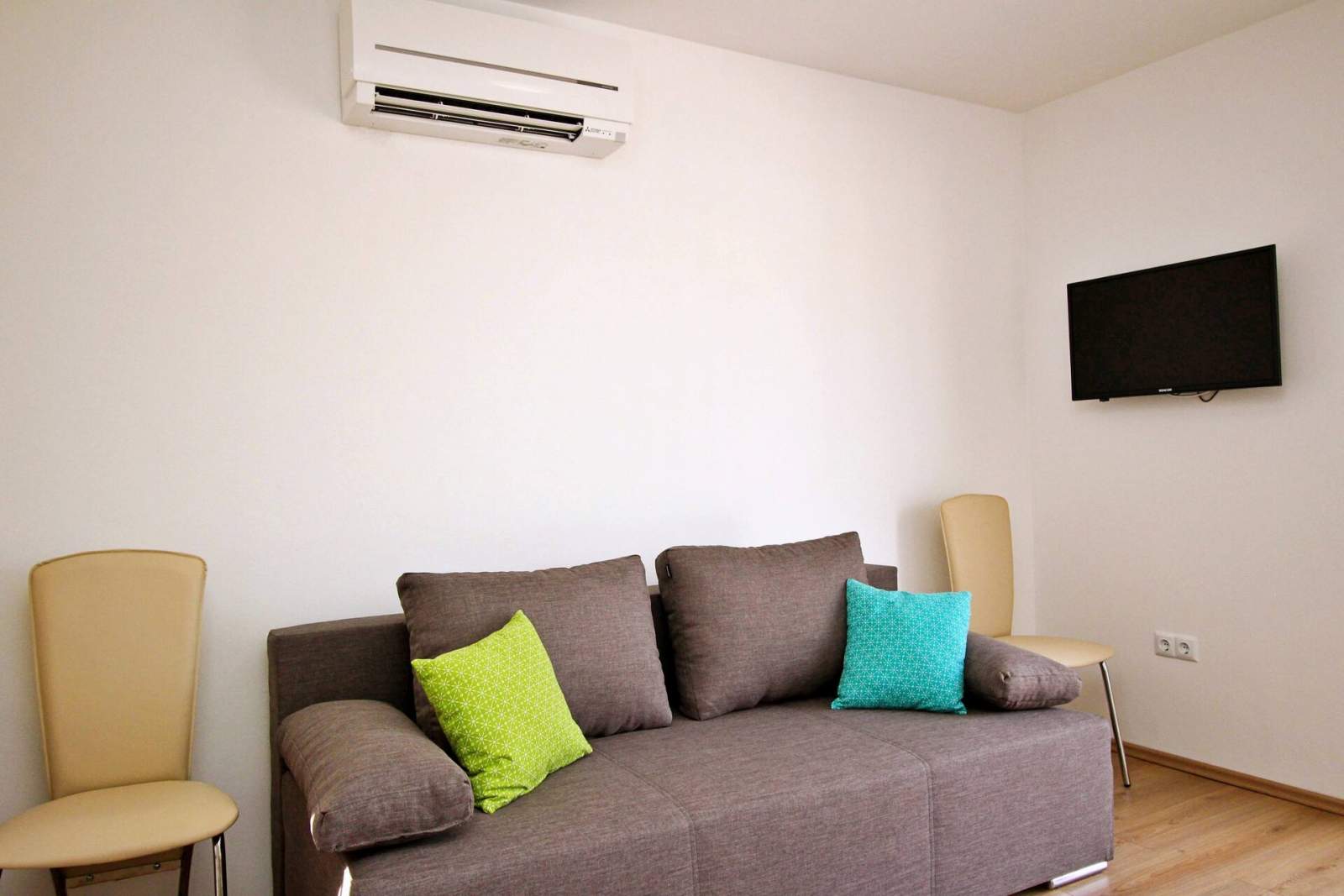 Just 60 meters from a sandy beach and 250 meters from the town center, this apartment is ideal for families or groups of 5-6 people. The apartment is located on the 1st floor and features two air-conditioned bedrooms—one with a queen-size bed and another with two single beds—plus a living room with a pull-out couch for two additional guests. The kitchen is fully equipped with an electric stove, oven, fridge with a freezing compartment, coffee machine, water kettle, and microwave. The dining area opens onto a private balcony (4 m2) with a stunning sea view, perfect for enjoying morning coffee or evening relaxation.