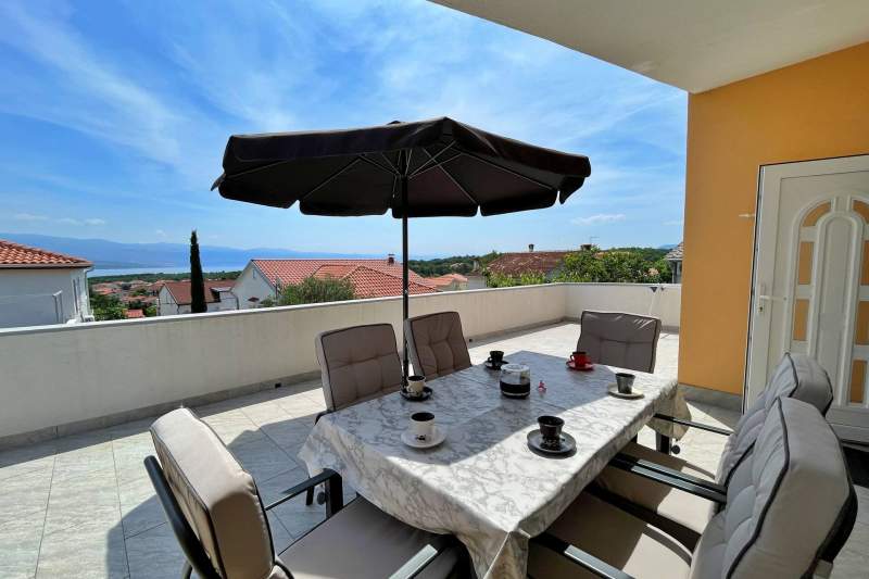 This elevated ground-floor apartment, located about 800 meters from the sea and town center, offers a comfortable stay for families or small groups. It features two bedrooms—one with a queen bed and the other with two single beds—and a spacious, roofed terrace (10 m2) overlooking a private garden with sun loungers. The fully equipped kitchen includes a ceran electric stove, fridge with freezer, oven, microwave, toaster, coffee machine, and kettle, alongside a dining and seating area with satellite/cable TV, Wi-Fi, and air conditioning. The bathroom has a shower, toilet, and hairdryer. Additional amenities include free parking, a shared BBQ in the yard, and a baby cot available on request. Pets are also welcome for an additional fee!