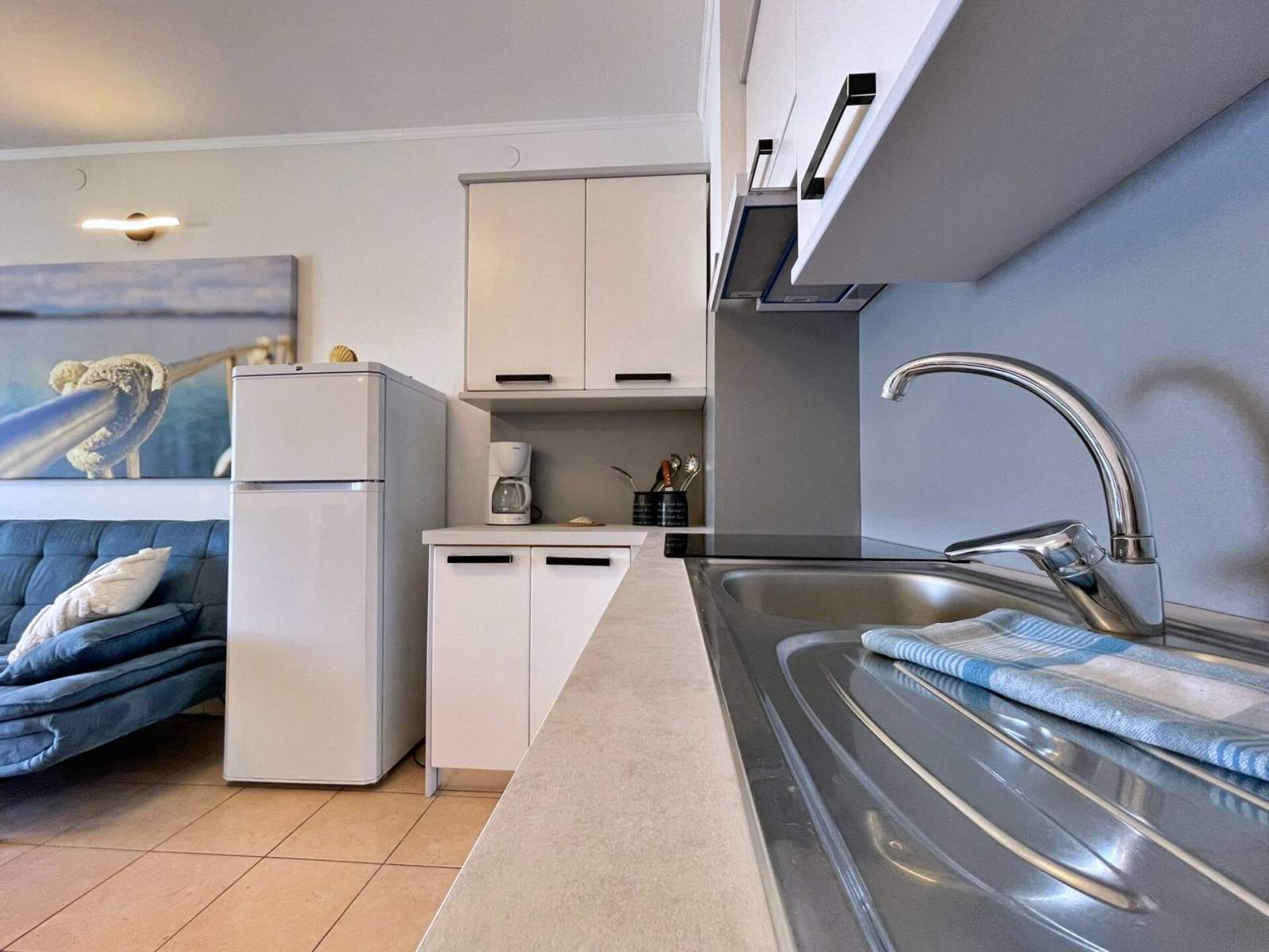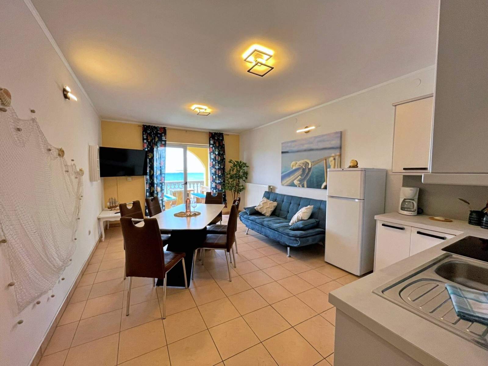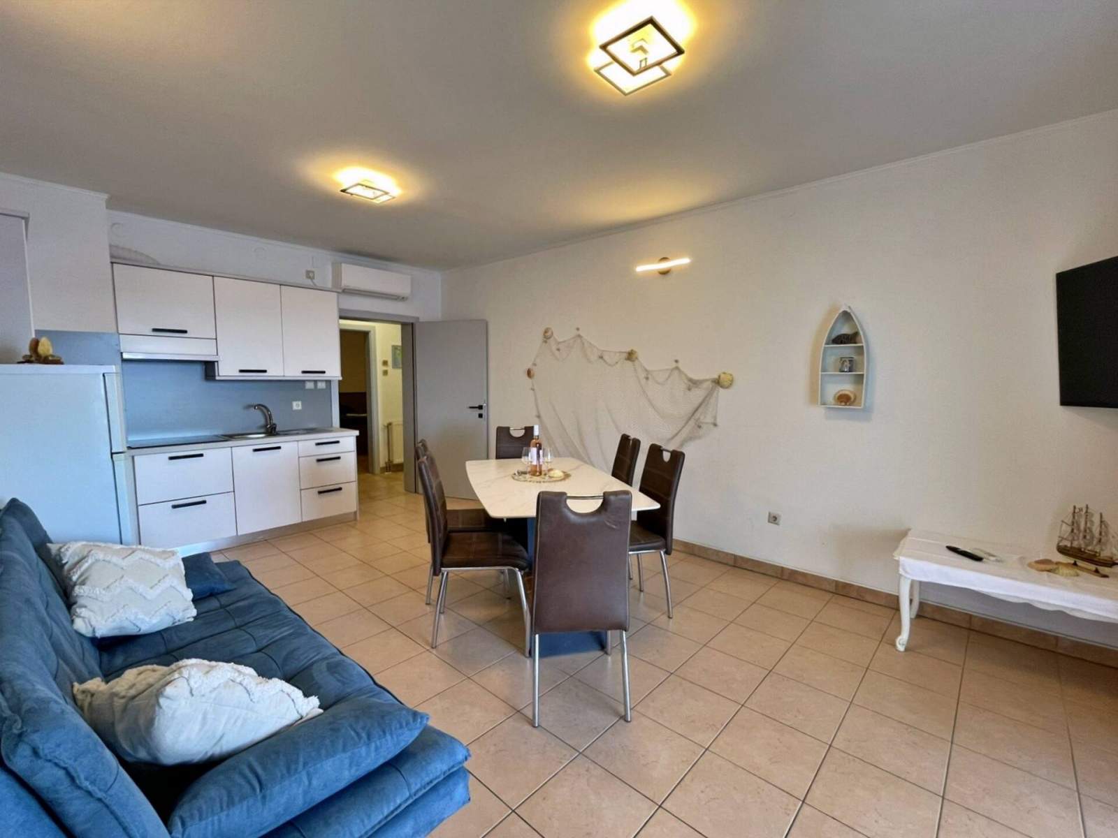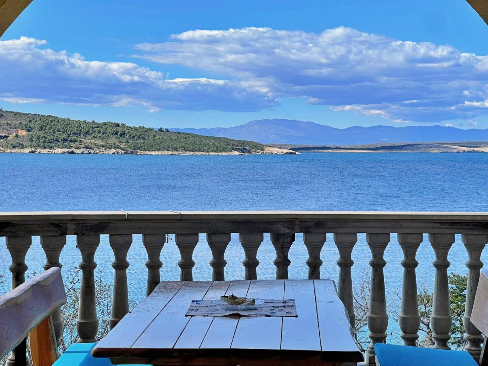 This seafront apartment, just 20 meters from the sea and beach, is located on the first floor and features two bedrooms — one with a queen-size bed and another with two single beds. The open-plan living, dining, and kitchen area includes a pull-out couch for an additional guest, air conditioning, and satellite/cable TV. The kitchen is equipped with a 4-burner induction stove, fridge with freezer, coffee machine, kettle, and toaster. The bathroom has a shower and toilet. Step onto the terrace (10 m2) with outdoor furniture and enjoy stunning views of the blue sea. Bed linens, towels, free Wi-Fi, and a parking space are provided. A popular local bistro and a diving center are conveniently located just downstairs, offering traditional Mediterranean cuisine and underwater adventure. In the diving center you can arrange a dive from the boat or from the shore.