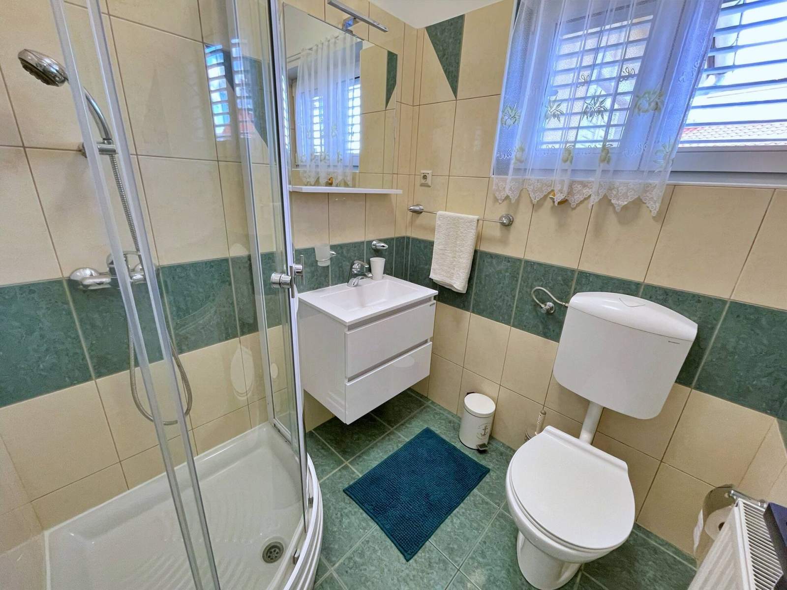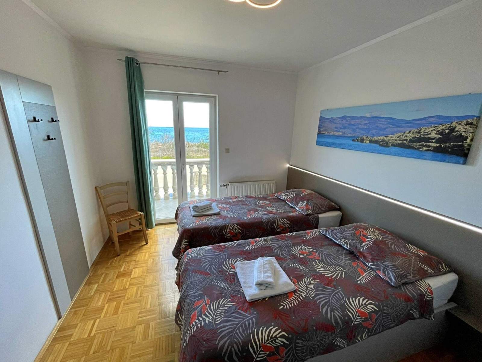 This apartment, just 20 meters from the sea and beach, is located on the first floor and features two bedrooms — one with a queen-size bed and another with two single beds. The open-plan living, dining, and kitchen area includes a dining table, couch, air conditioning, and satellite/cable TV. The kitchen is equipped with a 4-burner induction stove, fridge with freezer, coffee machine, kettle, and toaster. The bathroom has a shower and toilet. Step onto your private balcony (6 m2) with outdoor furniture and enjoy views of the backyard, nature, quiet street and sea. Bed linens, towels, free Wi-Fi, and a parking space are provided. A popular local bistro and a diving center are conveniently located just downstairs, offering traditional Mediterranean cuisine and underwater adventure. In the diving center you can arrange a dive from the boat or from the shore.
