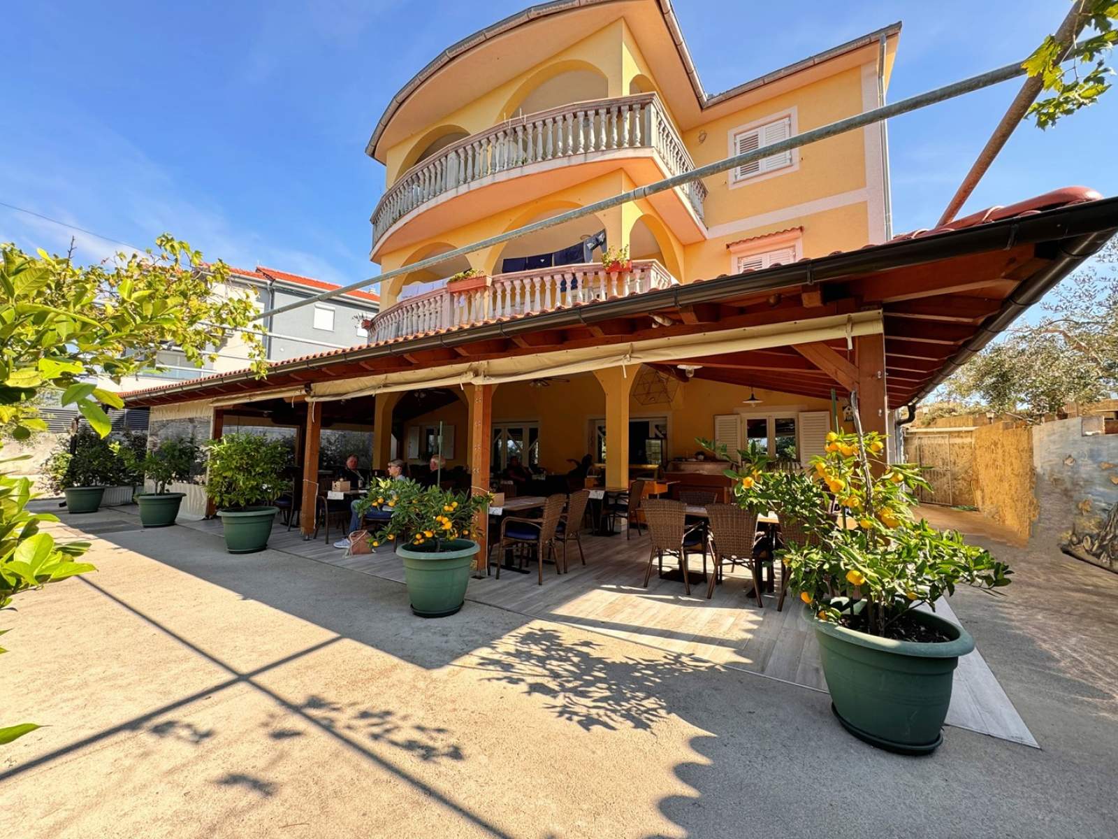The apartment does not have a balcony but is located close to the beach. Excellent food in the restaurant below.