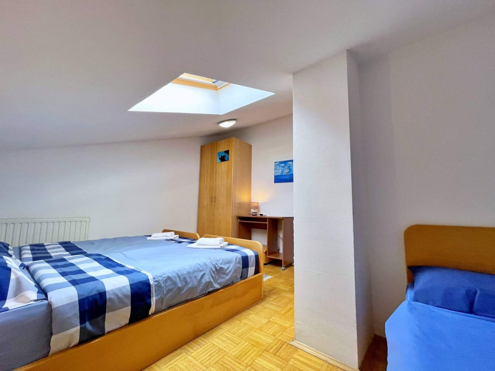 This apartment, just 20 meters from the sea and beach, is located in the attic and features one bedrooms with three single beds. The open-plan living, dining, and kitchen area includes a dining table, a pull-out couch for one person, air conditioning, and satellite/cable TV. The kitchen is equipped with a 4-burner electric stove, fridge with freezer, coffee machine, kettle, and toaster. The bathroom has a shower and toilet. Bed linens, towels, free Wi-Fi, and a parking space are provided. A popular local bistro and a diving center are conveniently located just downstairs, offering traditional Mediterranean cuisine and underwater adventure. In the diving center you can arrange a dive from the boat or from the shore.