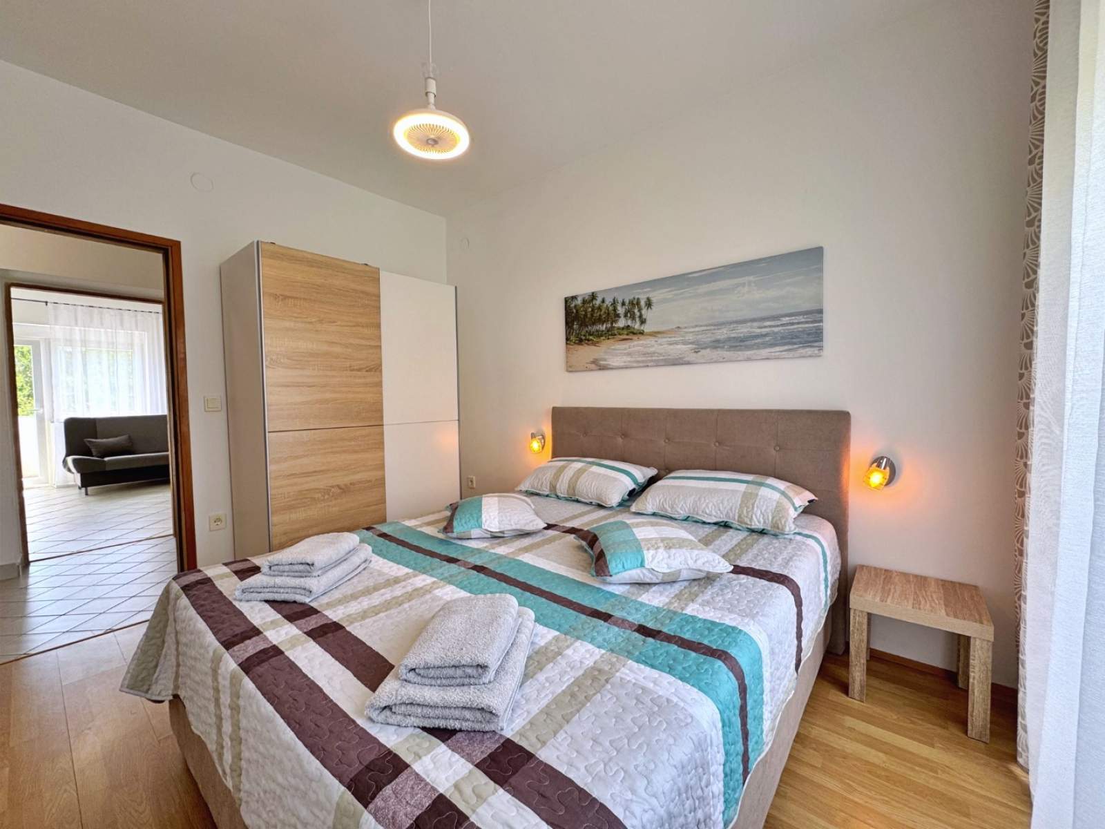 Located just 450 m from the sea and 40 m from a supermarket in a quiet area, this first-floor apartment is perfect for a relaxing stay. It features two bedrooms with queen-size beds, one of which has access to the balcony. The living room and kitchen share an open space equipped with an electric stove, oven, fridge, microwave, toaster, kettle, and coffee machine. The bathroom includes a shower, toilet, bidet, and hairdryer. The balcony (6 m2) with views of greenery is also accessible from the living room. Enjoy amenities like air conditioning, Wi-Fi, and free parking. Guests can also use the shared garden with a BBQ and seating area.