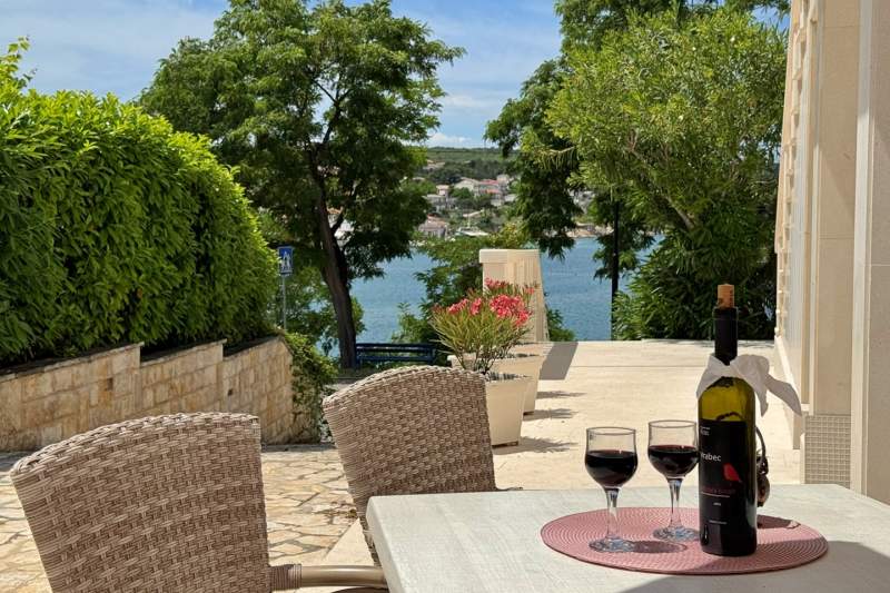 The villa is situated in a good location, right next to the city beach. It is a good place as a base for traveling around the island of Krk. I recommend going to the Potovosce beach near the town of Vrbnik. Beautiful. Olive trees and oleanders grow near the property. They create atmosphere. The area was quiet and peaceful, there were no parties in the distance, in the evenings you could hear music from a distance because local music festivals are often organized in the center. We used the apartment at the very top with a blue glass terrace. We didn't use it. Hot. But the large upper terrace makes up for this lack.