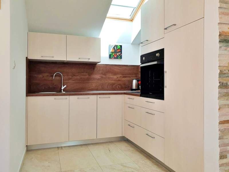 This cozy attic apartment offers two bedrooms with queen beds and a 15 m2 roofed terrace with a dining table and breathtaking panoramic sea views. The kitchen is fully equipped with a ceramic stove, oven, fridge with freezer, dishwasher, coffee machine, kettle, and a dining table. The living room features air conditioning, satellite TV, a sofa, and terrace access. The apartment includes a bathroom with a shower, toilet, and hairdryer. Guests enjoy free Wi-Fi, private parking, a gas BBQ, and access to a shared yard with a children's playground. Located just 160 m from the concrete and pebble beach, the house also offers floor cooling and heating for year-round comfort.