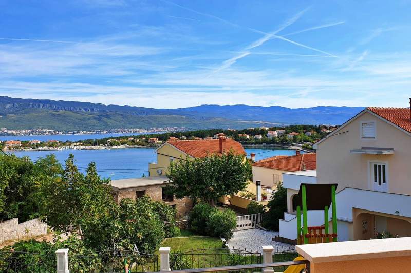 This cozy attic apartment offers two bedrooms with queen beds and a 15 m2 roofed terrace with a dining table and breathtaking panoramic sea views. The kitchen is fully equipped with a ceramic stove, oven, fridge with freezer, dishwasher, coffee machine, kettle, and a dining table. The living room features air conditioning, satellite TV, a sofa, and terrace access. The apartment includes a bathroom with a shower, toilet, and hairdryer. Guests enjoy free Wi-Fi, private parking, a gas BBQ, and access to a shared yard with a children's playground. Located just 160 m from the concrete and pebble beach, the house also offers floor cooling and heating for year-round comfort.