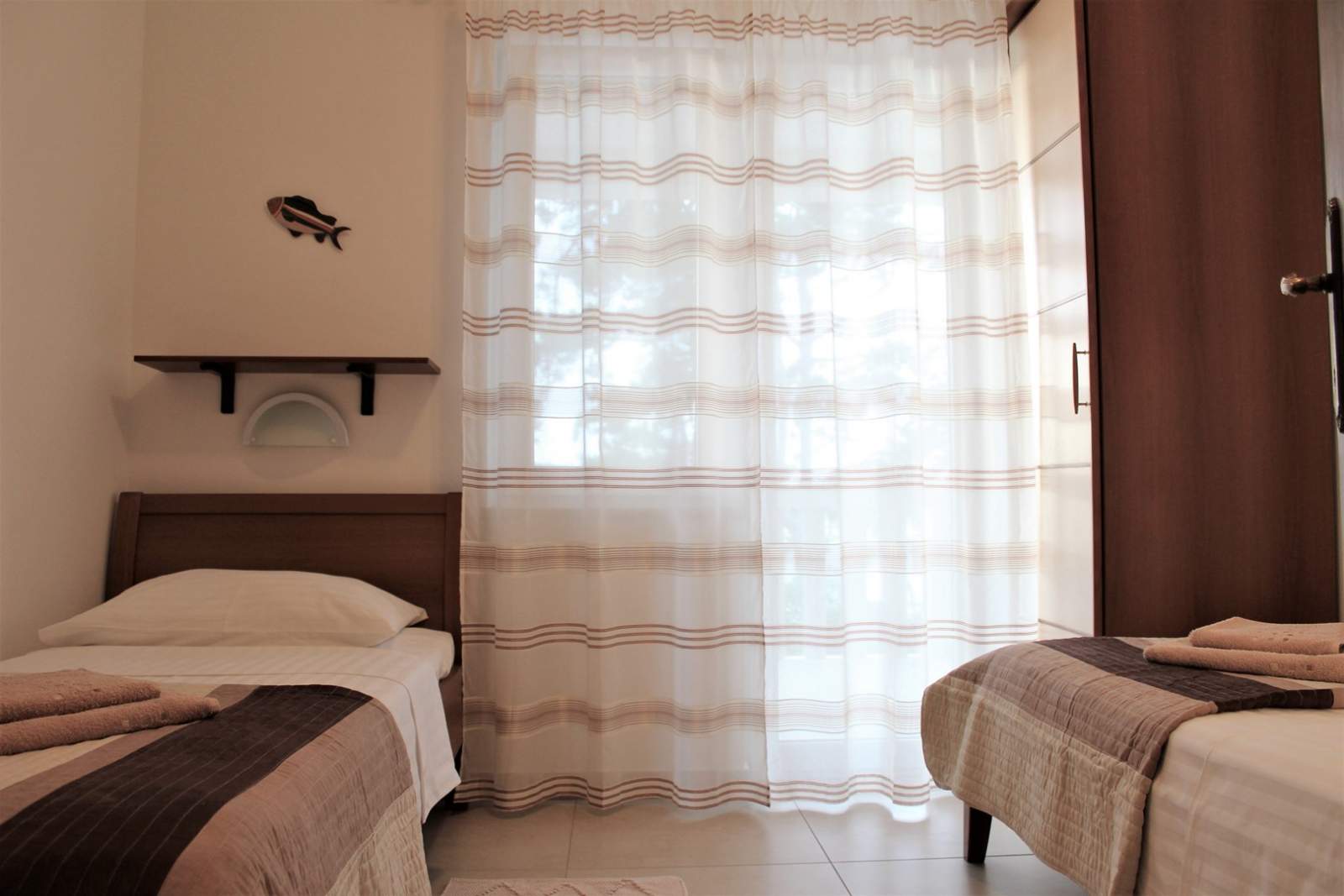 This cozy two-bedroom apartment is located on an elevated ground-floor in a house that is just 15 meters from the sea and beach, offering a sea view and easy access to nearby restaurants and a diving center. The fully equipped kitchen features an electric/gas stove, a mini-oven, fridge with freezer, coffee machine, kettle, toaster, dishwasher, and hand mixer. The living/dining room has a sofa, dining table, satellite TV, Wi-Fi, and air conditioning. One bedroom has a queen-size bed, while the other has two single beds. The bathroom includes a shower, toilet, and hairdryer. Enjoy the 25 m2 roofed patio with a dining area, parasol, sun loungers, and sea view. A garden with a BBQ and outdoor shower adds to the outdoor space. Private parking is available, and bed linens, towels, and iron are provided for your convenience.