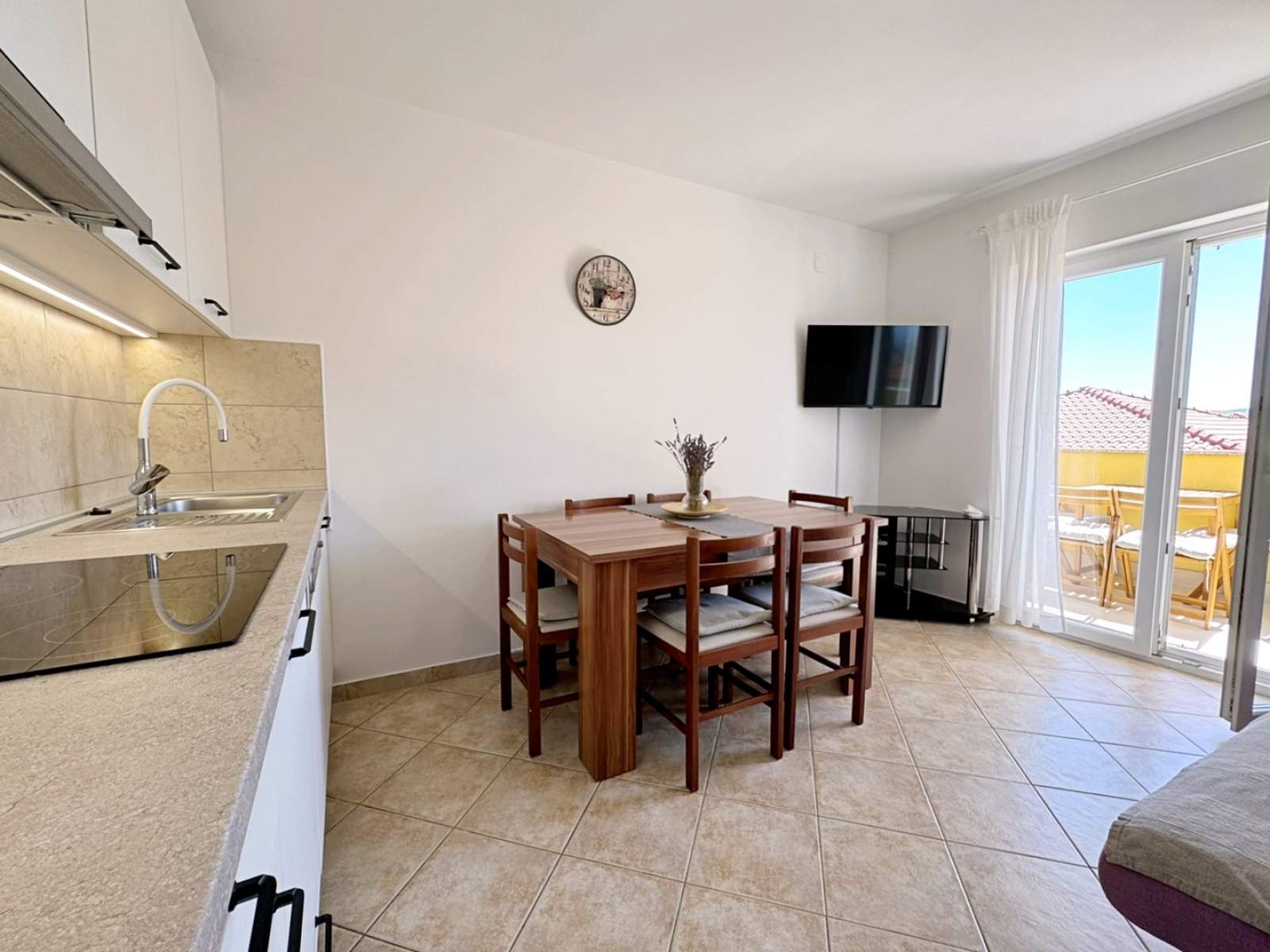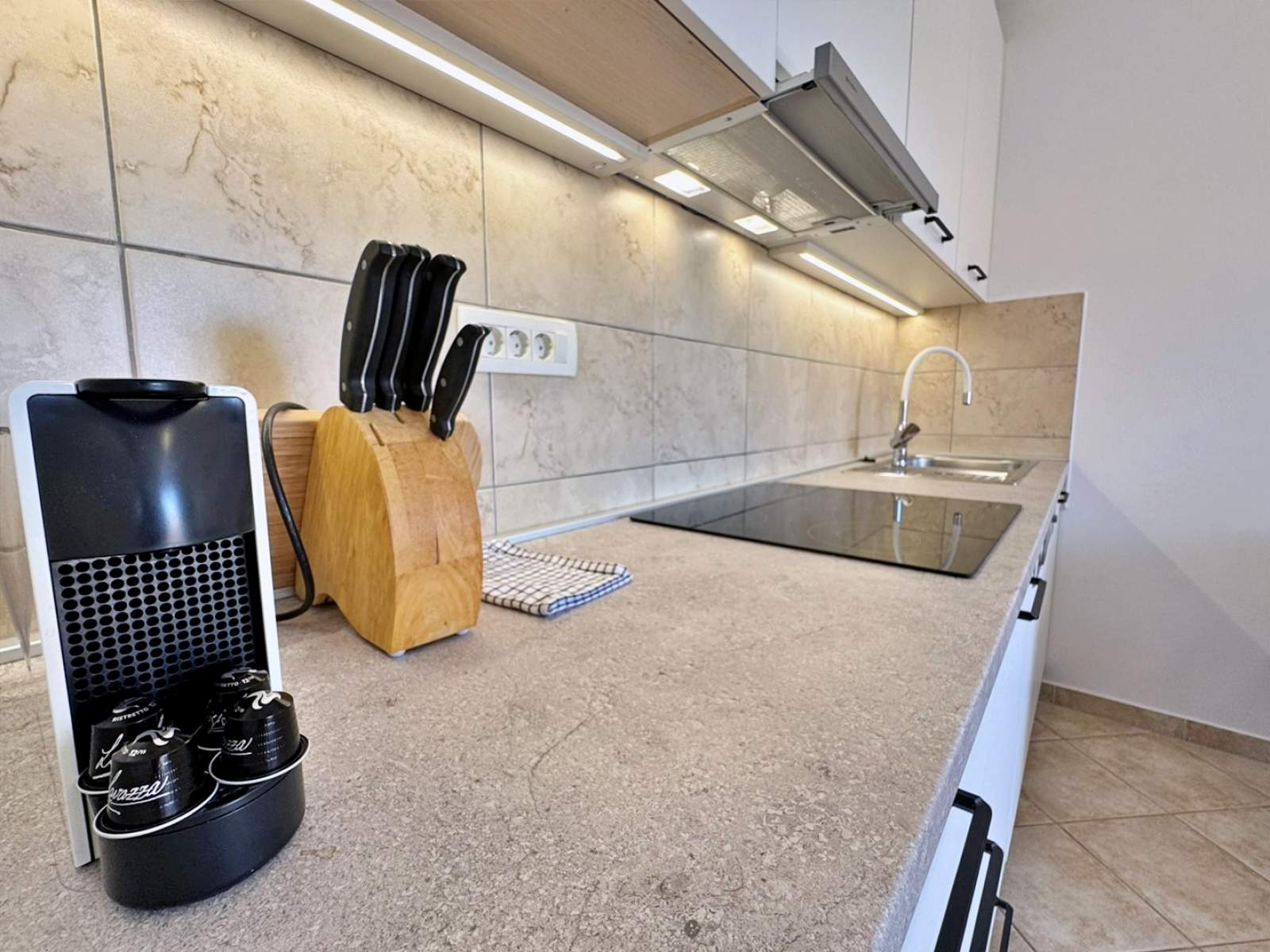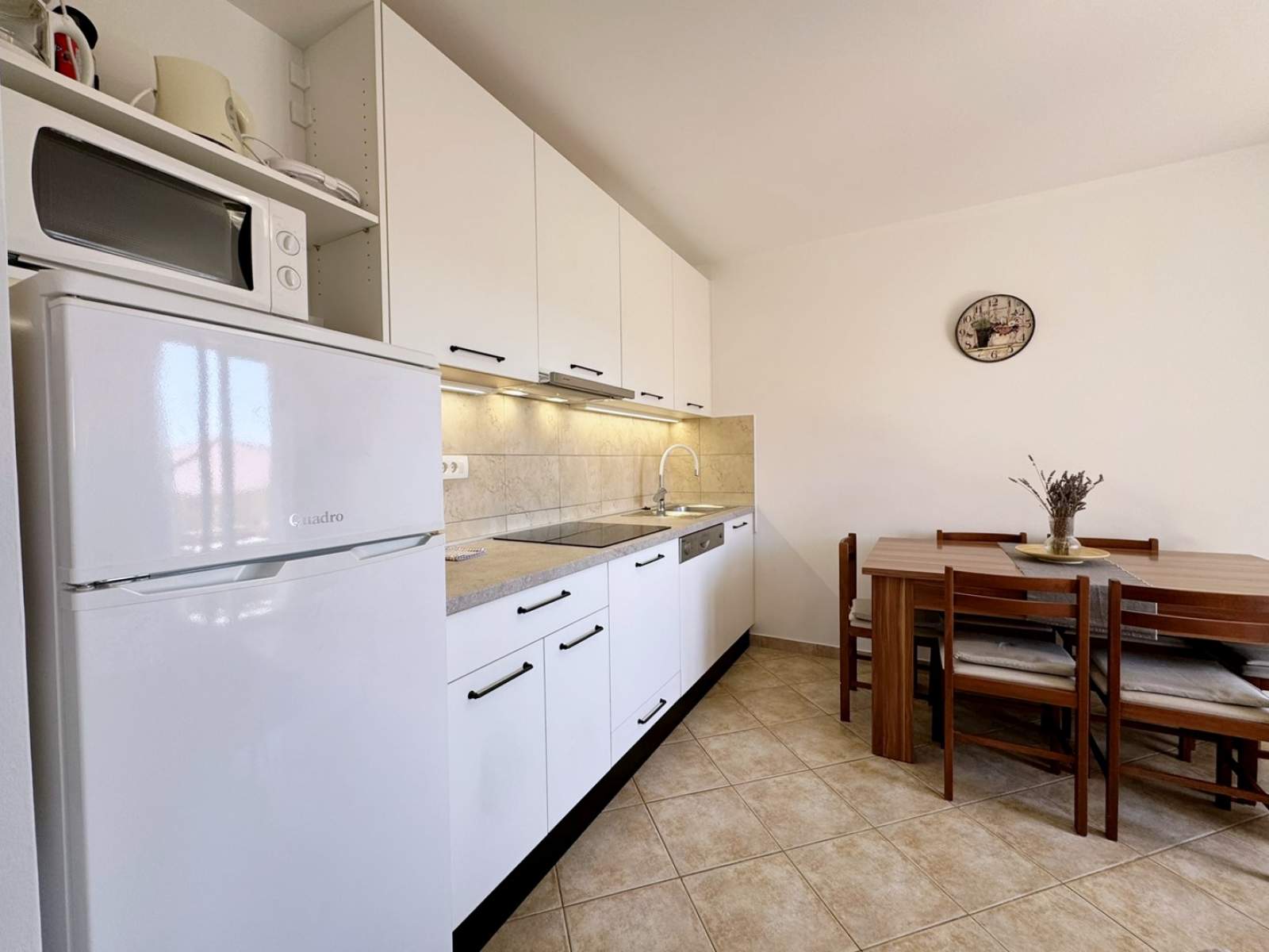 Ovaj apartman na 1. katu ima balkon od 4 m2 s pogledom na more. Klimatizirana kuhinja uključuje kera...
