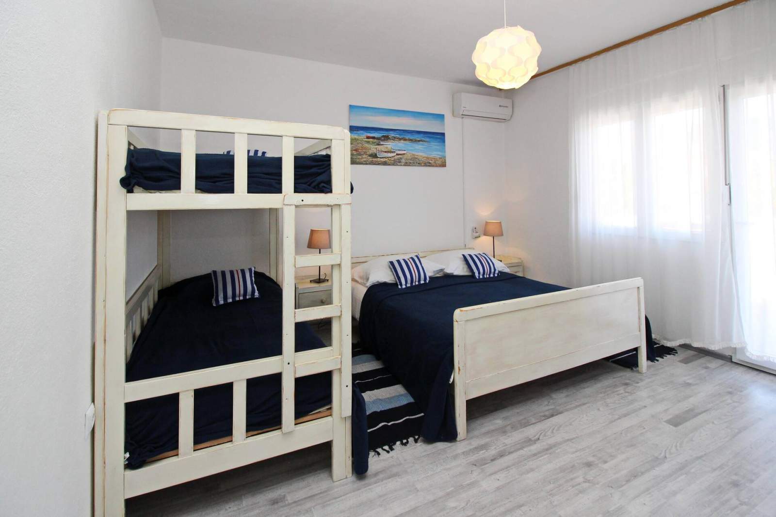 This comfortable 40m2 apartment on the first floor, for 4-6 persons offers two bedrooms (both with queen size beds and one has an additional bunk bed).