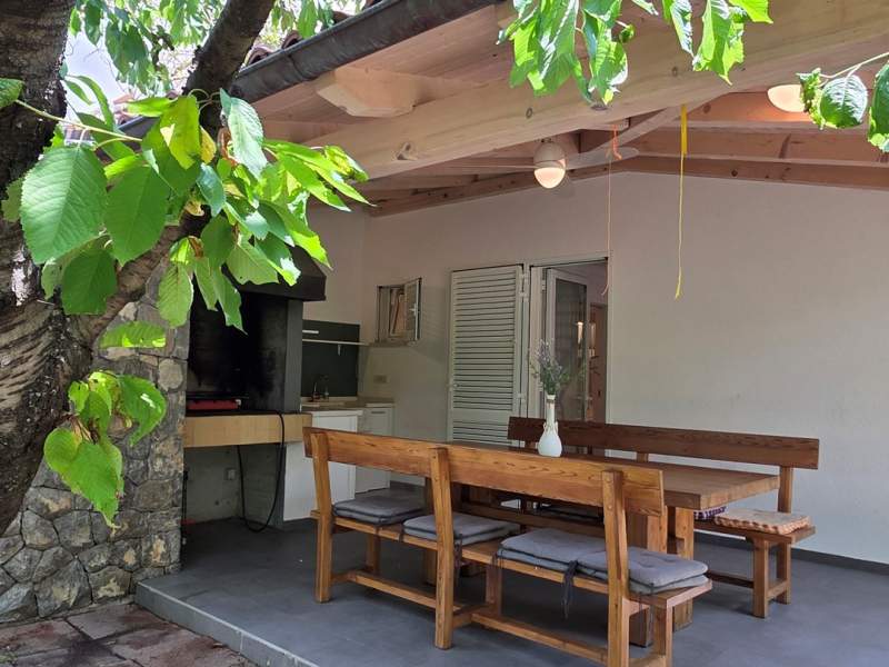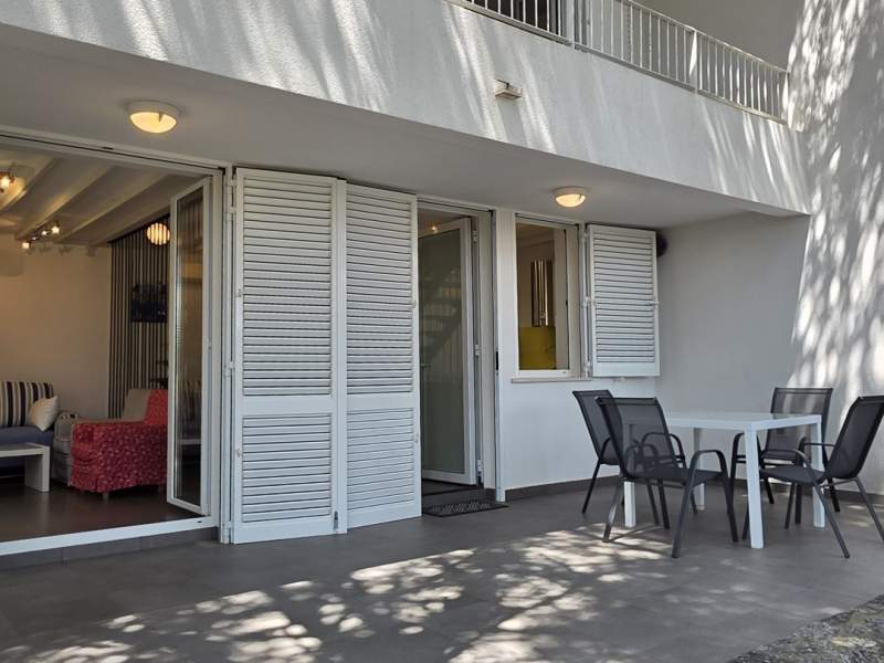 Raspolaže s dvije namještene terase. Veća terasa (25 m2) uključuje blagovaonski stol, ljetnu kuhinju i plinski roštilj.