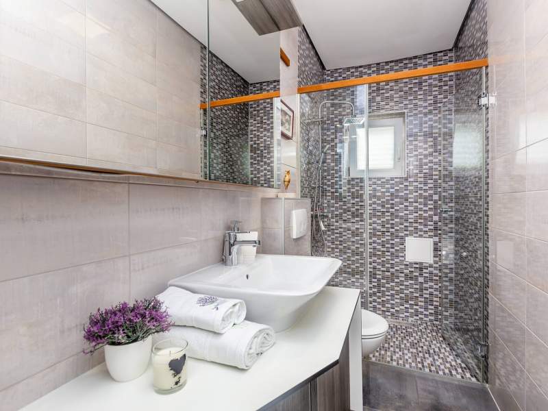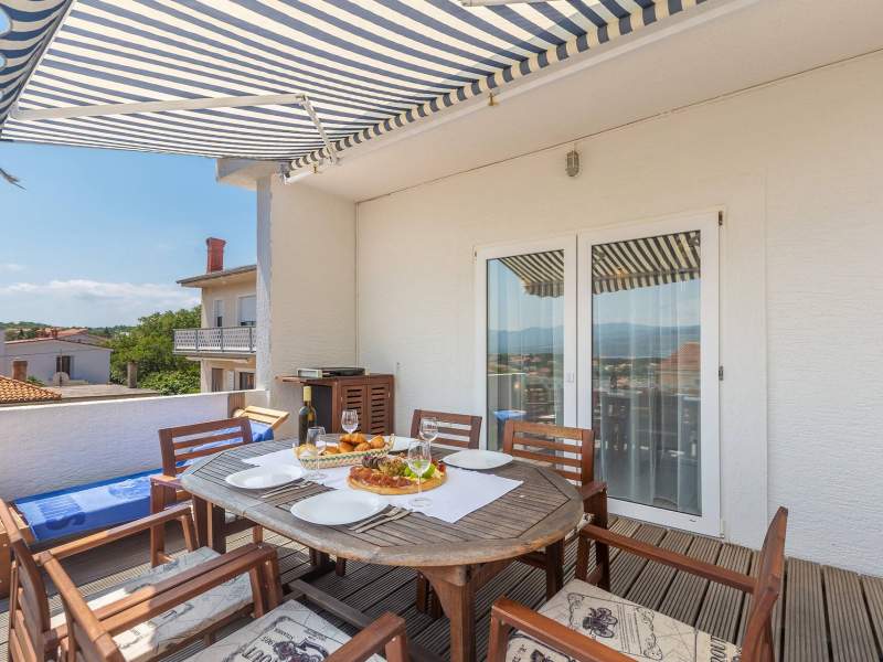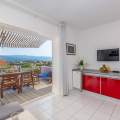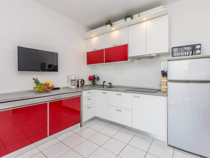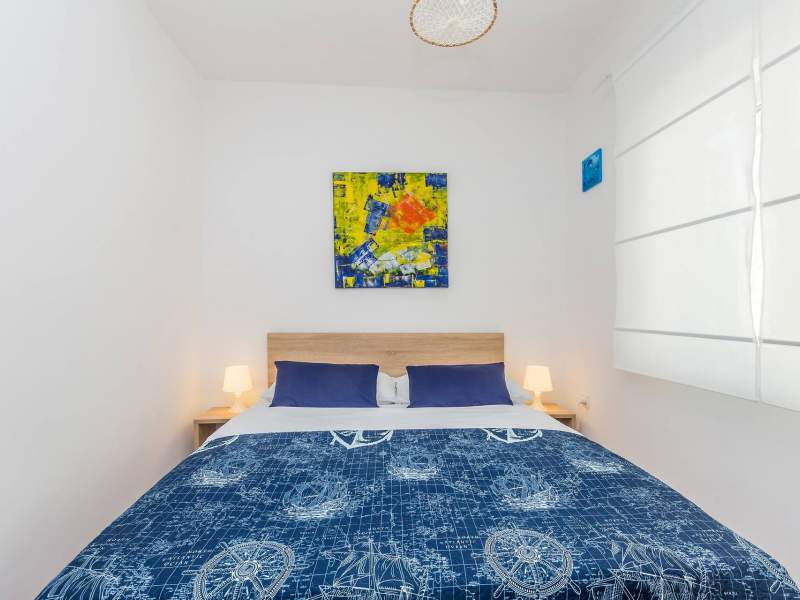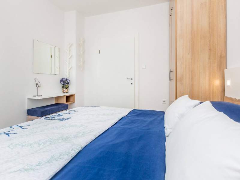 Ovaj moderan apartman na prvom katu, samo 270 m od mora i plaže, nudi ugodan boravak s privatnom terasom od 20 m2 sa stolom za blagovanje, ležaljkama i prekrasnim pogledom na more. Dobro opremljena kuhinja uključuje štednjak s 4 kola, pećnicu, hladnjak sa zamrzivačem, aparat za kavu, kuhalo za vodu, perilicu posuđa, mikser i mikrovalnu pećnicu, kao i udoban prostor za sjedenje sa satelitskom televizijom, klima uređajem i Wi-Fi, s izlazom na terasu. Obje spavaće sobe imaju bračne krevete, a kupaonica ima tuš, WC i sušilo za kosu. Dodatne pogodnosti uključuju roštilj u prizemlju, posteljinu, ručnike, glačalo, dječji krevetić i hranilicu.
