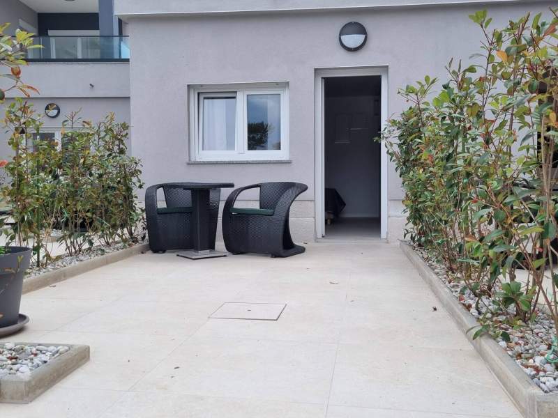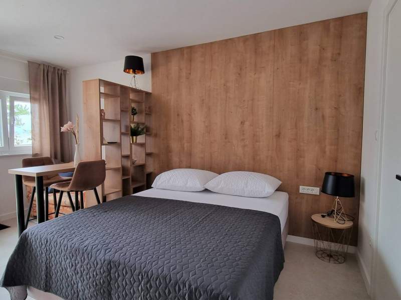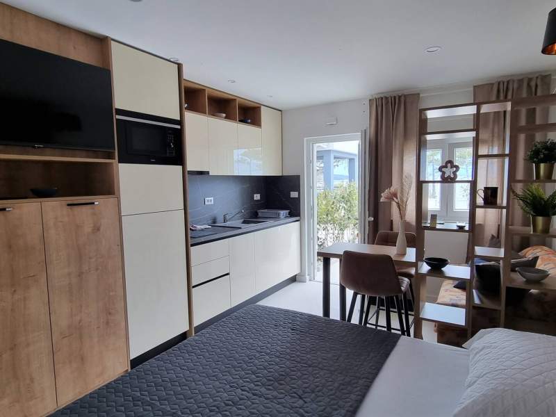 Ovaj luksuzni, moderni studio apartman uz more nalazi se u apartmanskom kompleksu samo 30 metara od mora, okružen prirodom, skrovitim uvalama, šljunčanim plažama i pješačkim stazama. Nudi zajednički bazen s morskom vodom (36 m2) otvoren od svibnja do listopada, s temperaturama koje obično dosežu 20-26°C. Studio apartman se nalazi u prizemlju i ima jedan bračni krevet, Smart TV, dobro opremljenu kuhinju/blagovaonicu i prostor za sjedenje s indukcijskom pločom za kuhanje, hladnjakom i zamrzivačem, kuhalom za vodu, aparatom za kavu, tosterom, mikrovalnom pećnicom i perilicom posuđa. Kupaonica ima tuš i WC. Besplatan Wi-Fi dostupan je u cijelom objektu.