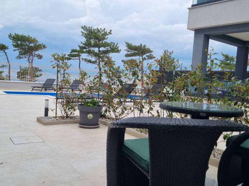 S namještene terase (15 m2) pruža se prekrasan pogled i na bazen i na more. Bazenski prostor u prizemlju opremljen je ležaljkama, suncobranima i vanjskim tušem te omogućuje izravan pristup moru za ugodno kupanje. Zajednička praonica rublja u prizemlju uključuje perilicu rublja, kapsule/deterdžent za pranje rublja i glačalo za goste.