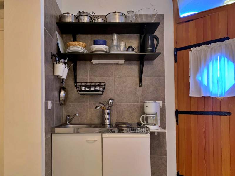 Uživajte u opuštajućem ljetnom odmoru u ovom šarmantnom studio-apartmanu za dvoje koji se nalazi u mirnom mjestu Šilo na otoku Krku. Ovaj elegantan prostor ima sve što vam je potrebno: prostor za sjedenje s kaučem, stol za blagovanje, satelitsku TV, klima uređaj, bračni krevet i dobro opremljenu čajnu kuhinju s električnim štednjakom na 2 plamenika, mini-hladnjakom, aparatom za kavu, kuhalom za vodu, mikrovalnom pećnicom i tosterom. Kupaonica uključuje tuš i WC.
