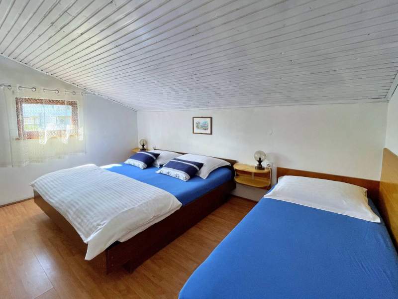Ovaj lijepo uređen apartman u potkrovlju kuće, na 2. katu, smješten samo 250 metara od mora i 290 metara do pješčane plaže, savršeno je mjesto za odmor s pogledom na more. Prostrana privatna terasa od 35 m2 djelomično je natkrivena te idealna za blagovanje na otvorenom uz prijenosni roštilj. Unutrašnjost uključuje kuhinju koja sadrži ceran štednjak s 4 kola, pećnicu, hladnjak sa zamrzivačem, aparat za kavu, kuhalo za vodu, mikrovalnu pećnicu, mikser i perilicu posuđa. Dnevni boravak/blagovaona uključuje udoban kauč, stol za blagovanje, satelitsku/kabelsku TV, Wi-Fi i klima uređaj. Apartman ima tri spavaće sobe: jednu s bračnim krevetom i jednostrukim krevetom, a druge dvije s bračnim krevetima. Tu su i dvije kupaonice za dodatnu udobnost — jedna s kadom, WC-om, perilicom rublja i sušilom za kosu, a druga s tušem i WC-om. Privatni parking, posteljina, ručnici, glačalo i daska za glačanje su osigurani kako bi Vaš boravak bio ugodan i bezbrižan.