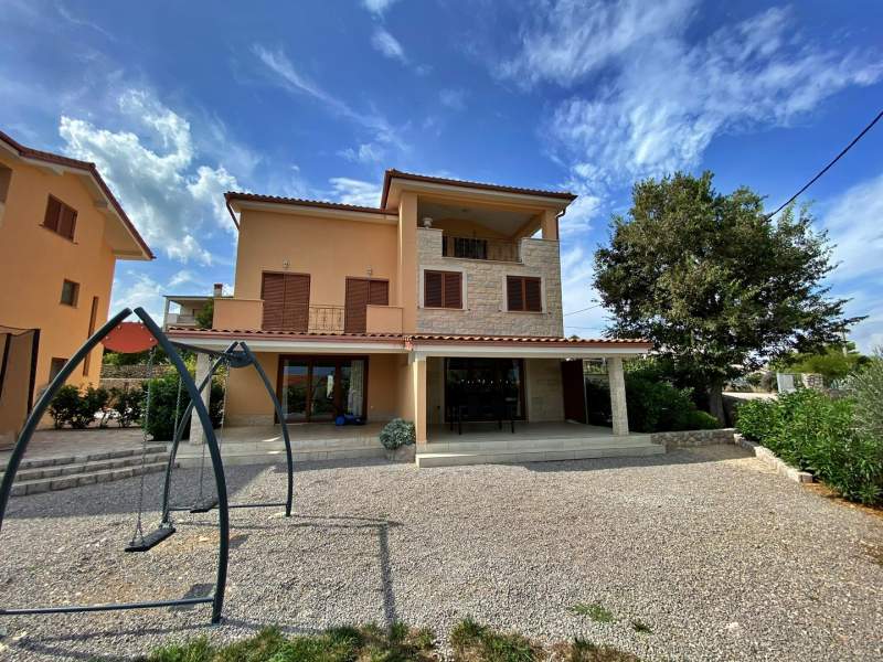 This lovely apartment spans the ground and first floor, featuring two bedrooms with queen beds and sea views. The ground floor includes a 15 m2 roofed terrace with a dining table and sea views. The kitchen is fully equipped with a ceramic stove, microwave, fridge with freezer, dishwasher, coffee machine, kettle, and dining table. The living room offers air conditioning, satellite TV, a sofa, and terrace access. The apartment has a bathroom with a shower, toilet, and hairdryer, plus an additional toilet. Guests enjoy free Wi-Fi, private parking, a gas BBQ, and a shared yard with a children's playground. Located just 160 m from a concrete and pebble beach, the house also features floor cooling and heating for year-round comfort. (English)