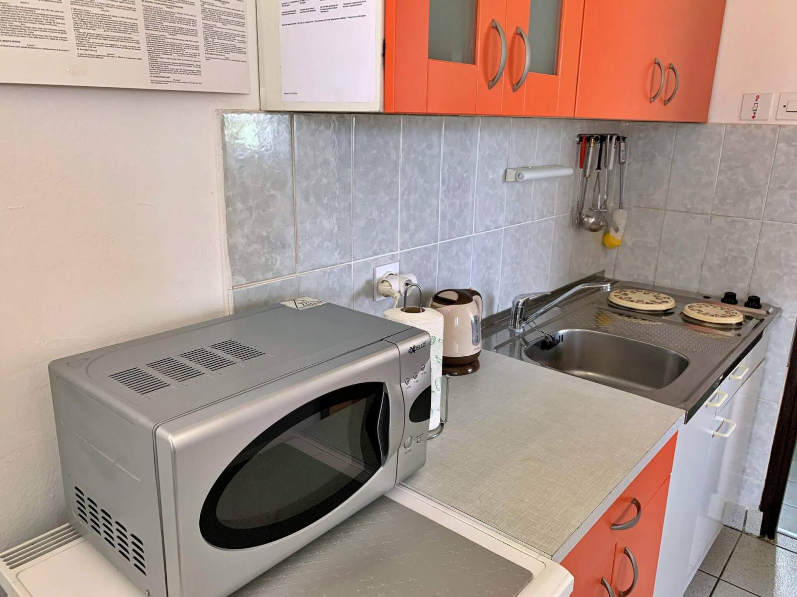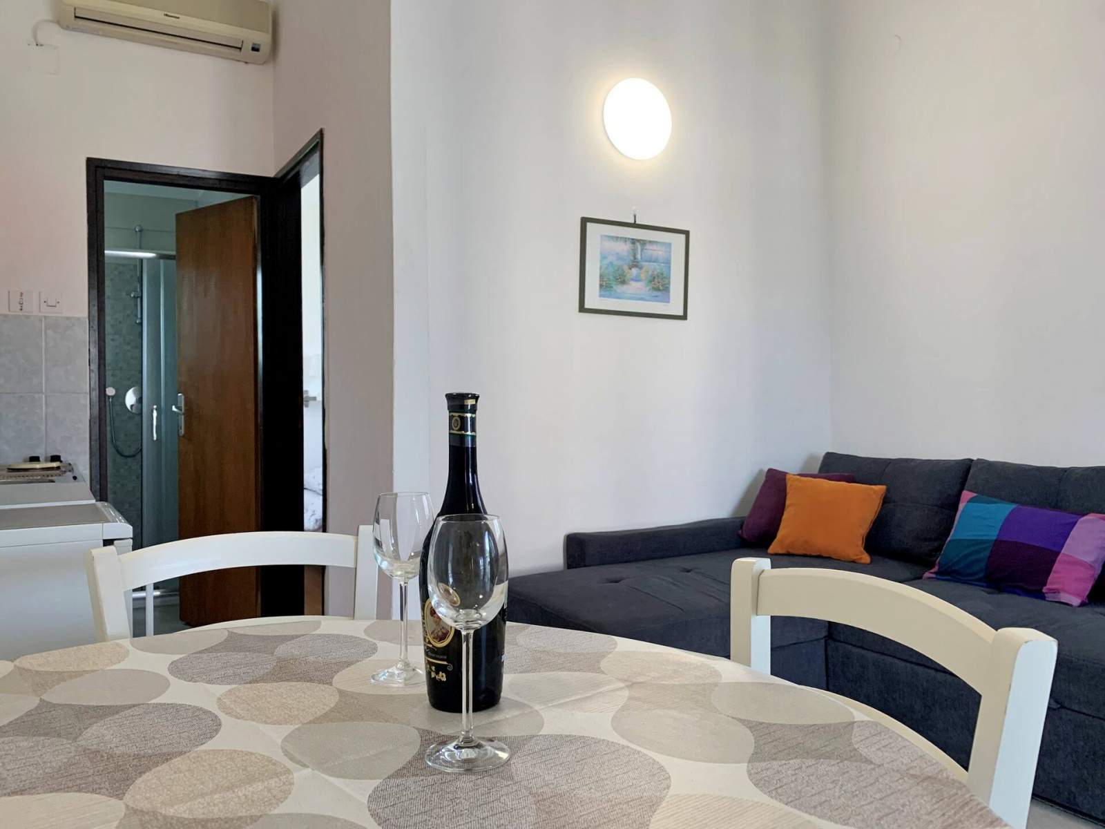Dieses Apartment im ersten Stock liegt nur 240 Meter vom Meer entfernt und bietet Bequemlichkeit und Komfort. Es verfügt über ein gemütliches Schlafzimmer mit einem Doppelbett sowie eine ausziehbare Couch im Wohnzimmer und bietet Platz für bis zu drei Gäste. Genießen Sie die geräumige, überdachte Terrasse (20 m2) mit Meerblick und Gartenmöbeln, die Sie mit dem Nachbarapartment teilen. Im Inneren finden Sie eine gut ausgestattete Küchenzeile mit Elektroherd, Kühlschrank, Mikrowelle, Toaster, Kaffeemaschine und Wasserkocher. Zu den Annehmlichkeiten gehören WLAN, Satelliten-/Kabelfernsehen, Klimaanlage, ein Badezimmer mit Dusche und Haartrockner sowie ein Bügeleisen, kostenlose Parkplätze und ein gemeinsamer Grill im Hof. Der Sandstrand liegt 240 Meter vom Apartment entfernt.