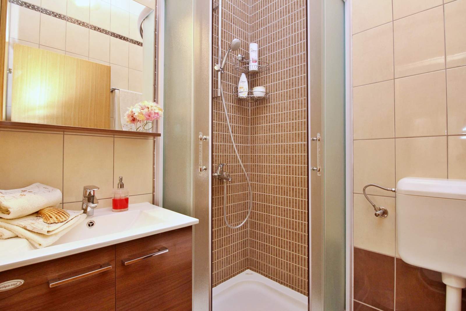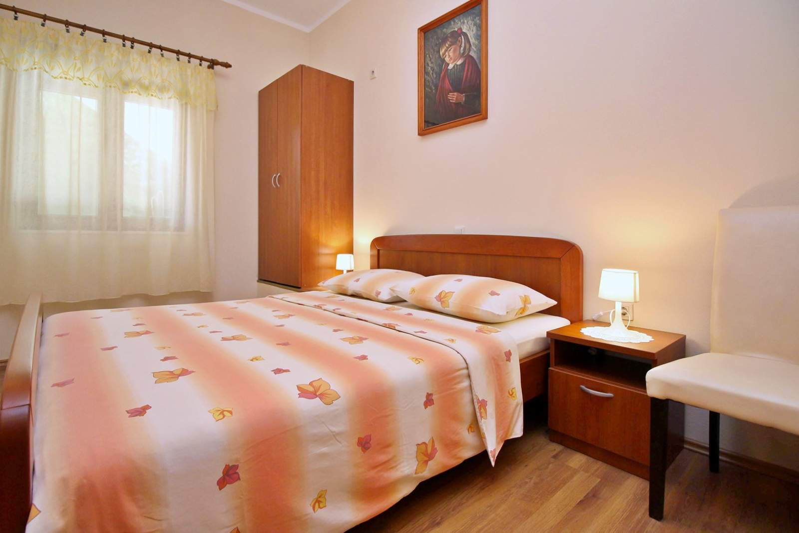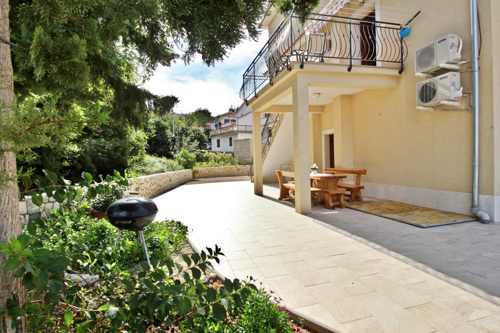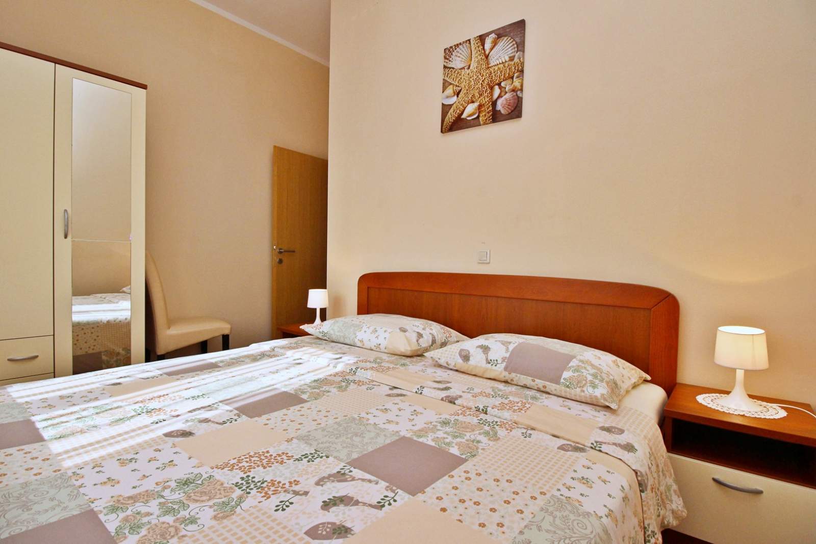 Dieses geräumige Apartment im Erdgeschoss, 180 Meter vom Meer entfernt, verfügt über zwei Schlafzimmer mit jeweils einem Doppelbett. Der Wohnbereich umfasst einen Esstisch, Satellitenfernsehen, Klimaanlage und eine ausziehbare Couch für eine Person sowie direkten Zugang zu einer 30 m2 großen, überdachten Terrasse mit Blick auf den Garten und den Innenhof. Die voll ausgestattete Küche bietet einen Elektroherd, einen Backofen, einen Kühlschrank, eine Mikrowelle, einen Geschirrspüler, eine Kaffeemaschine und einen Wasserkocher. Das Badezimmer verfügt über eine Dusche und eine Toilette. Die Wohnung hat auch kostenloses WLAN, privaten Parkplatz und einen Grillbereich.