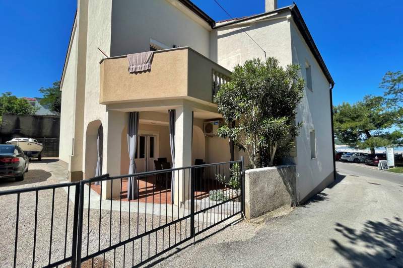 This cozy apartment for 2 to 4 guests is located in the romantic town of Šilo on the Island of Krk, just 40 meters from the sea and close to the sandy beach. It features a bedroom with a queen bed, air conditioning, a sofa bed in the living room, a fully equipped kitchen, and a dining area. The terrace includes a dining table and sun loungers. BBQ facilities are shared on a terrace with a sea view. Air conditioning, Wi-Fi, and private parking are included. Pets are welcome (charges may apply).