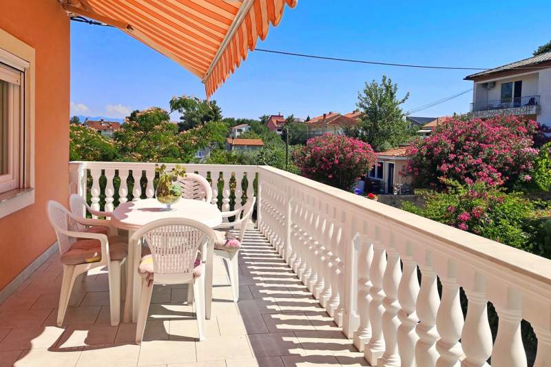 Enjoy a serene getaway in this first-floor apartment in Šilo, Krk Island, ideal for families or groups. It offers three bedrooms (queen beds, one with a pull-out sofa), a cozy living room with satellite TV, Wi-Fi, a dining room, and fully equipped kitchen