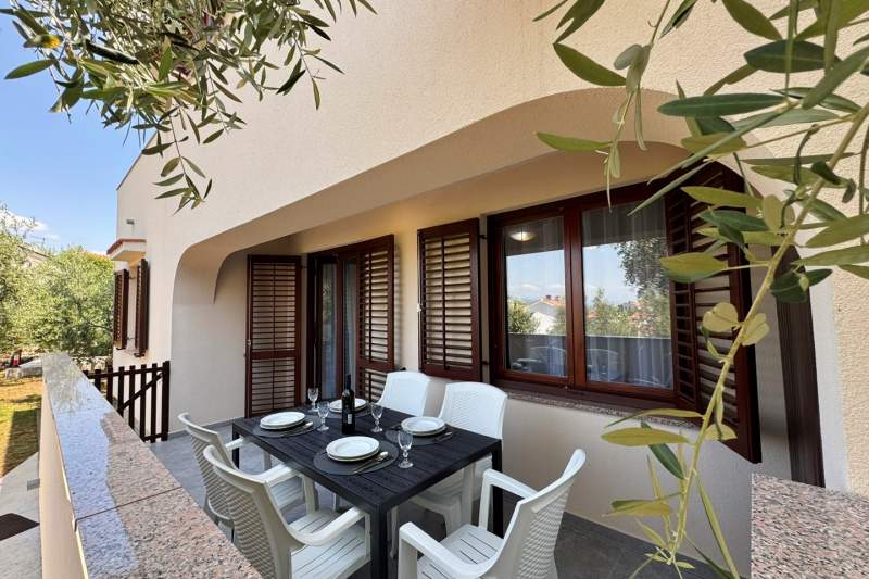 Spacious ground-floor apartment, 200 m from the sea, with two queen-bed bedrooms. The living area has a dining table, satellite TV, air conditioning, a pull-out couch, and access to a 30 m2 roofed terrace with garden views. The kitchen includes an electric stove, oven, fridge, microwave, dishwasher, coffee machine, and kettle. Bathroom with shower, free Wi-Fi, private parking, and a BBQ area ensure a relaxing stay.