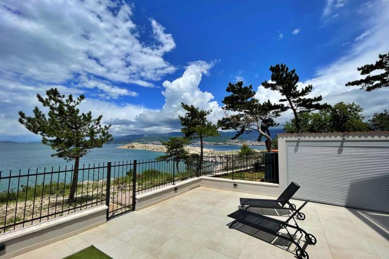 This luxury apartment with sea view is located in a building complex and in a peaceful area. The building has a large saltwater pool (40 m2) for all the guests in the house to use. On the ground floor of the building guests can rest on deckchairs next to the pool. The apartment is located on the ground floor and has a private parking behind the building. There is also a large pebble beach in the immediate vicinity, and a great restaurant, which also offers a selection of local specialties.