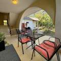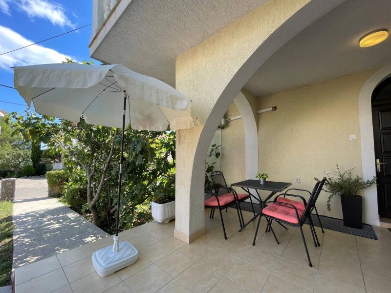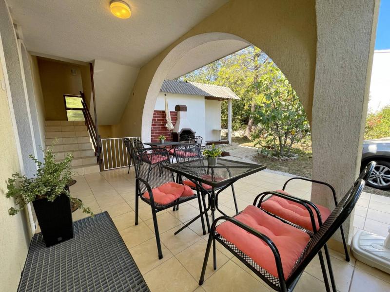 Outside, a spacious, roofed terrace — shared with the neighboring apartment — with its own outdoor furniture and a parasol for relaxation. A shared BBQ area is conveniently located beside the terrace. Pets are welcome for an additional fee, and a baby cot is available upon request (subject to availability). Ample parking space is available just in front of the terrace.