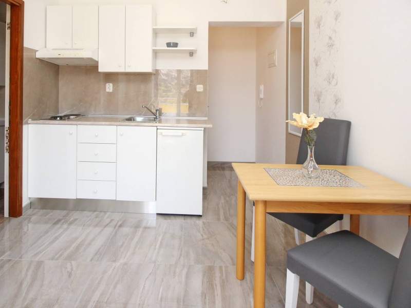 The apartment comes with a kitchen with living and dining area, a bathroom (shower, toilet) and a balcony with sea view (6 m2).