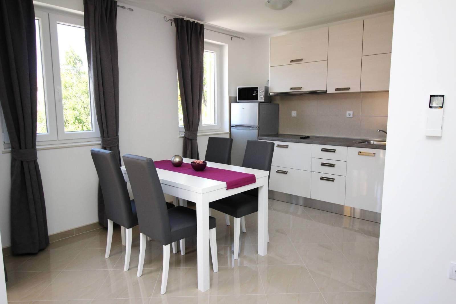 The apartment consists of one bedroom, a bathroom (shower, toilet, hair dryer, washing machine), a bright living area with air conditioning, SAT TV, free Wi-Fi and with fully equipped kitchen. The kitchen includes an electric stove, fridge with a freezer, dishwasher, microwave, coffee maker and kettle. Kitchen utensils are included.