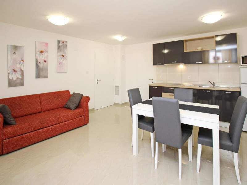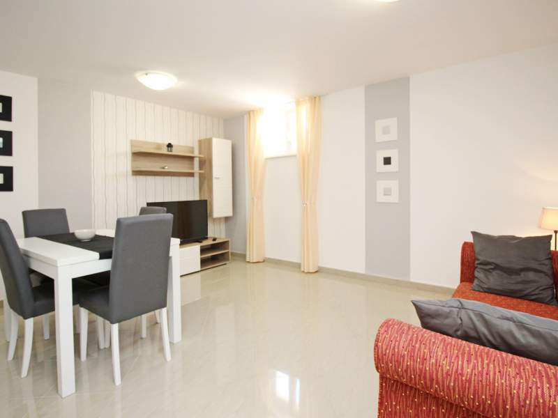 This modern, spacious apartment is located on the underground level (subterrain) of a house with shared pool, about 300 m from the main beach of Baska and 200 m from the city center.