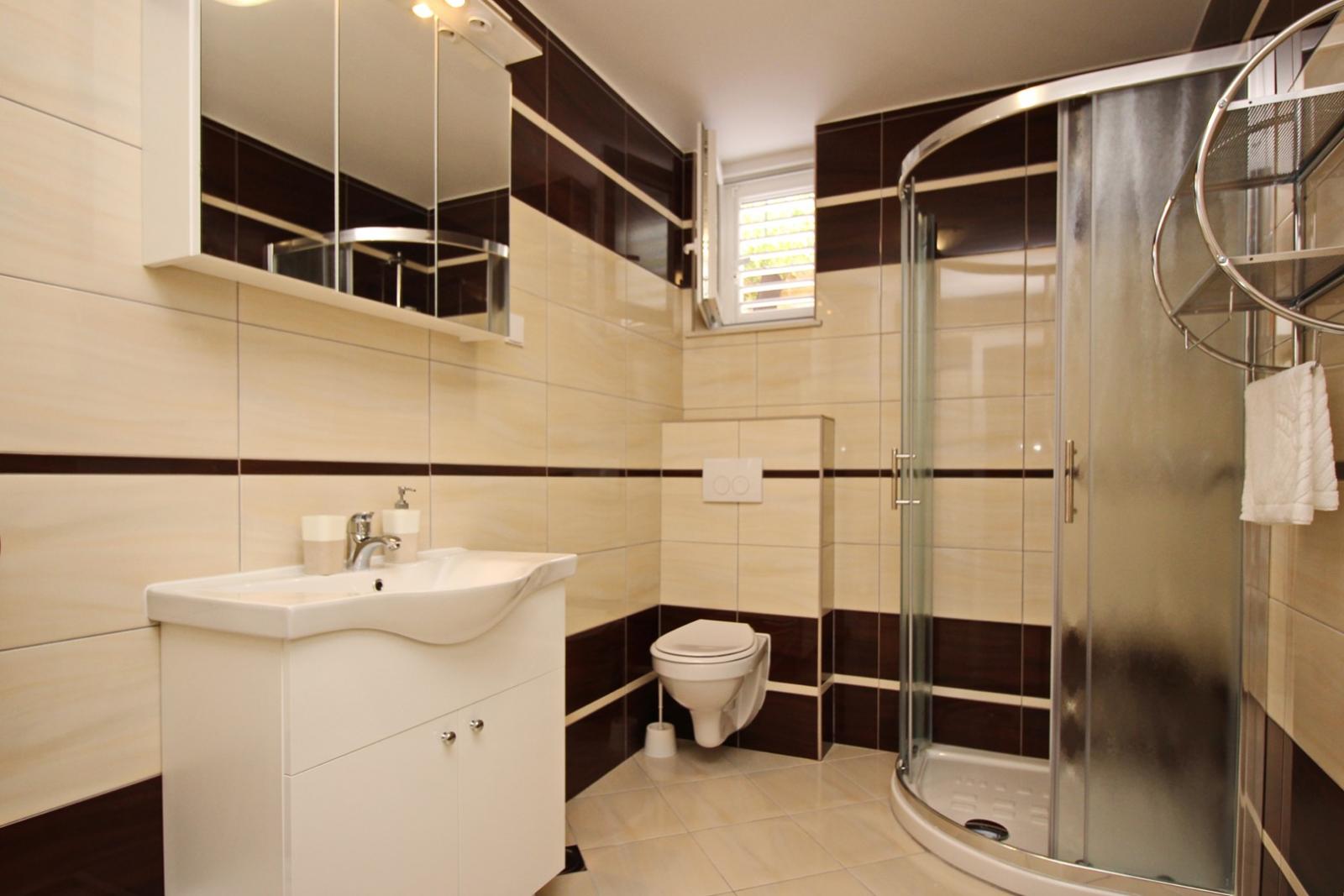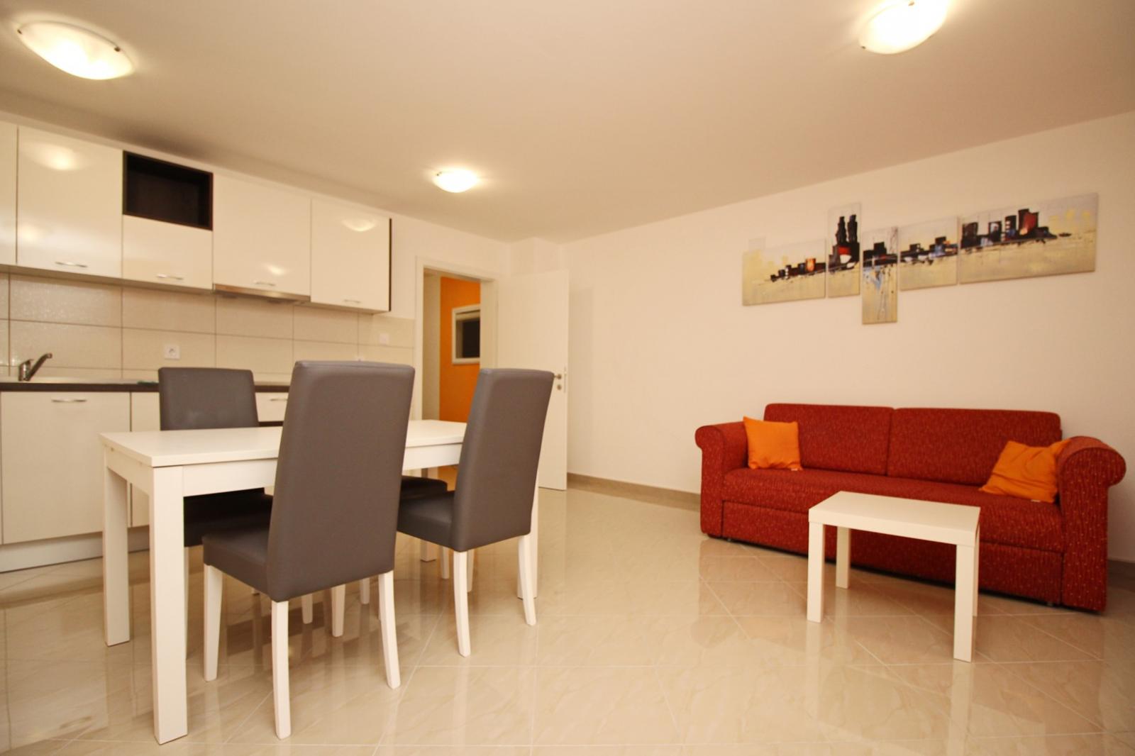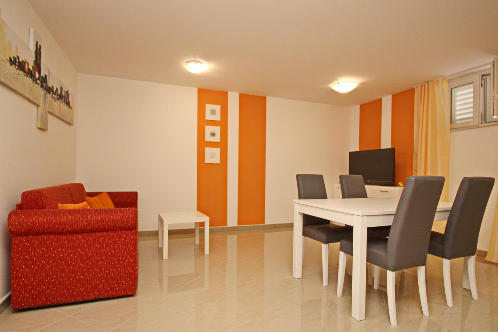 This modern, spacious apartment is located on the underground level (subterrain) of a house with shared pool, about 300 m from the main beach of Baska and 200 m from the city center.