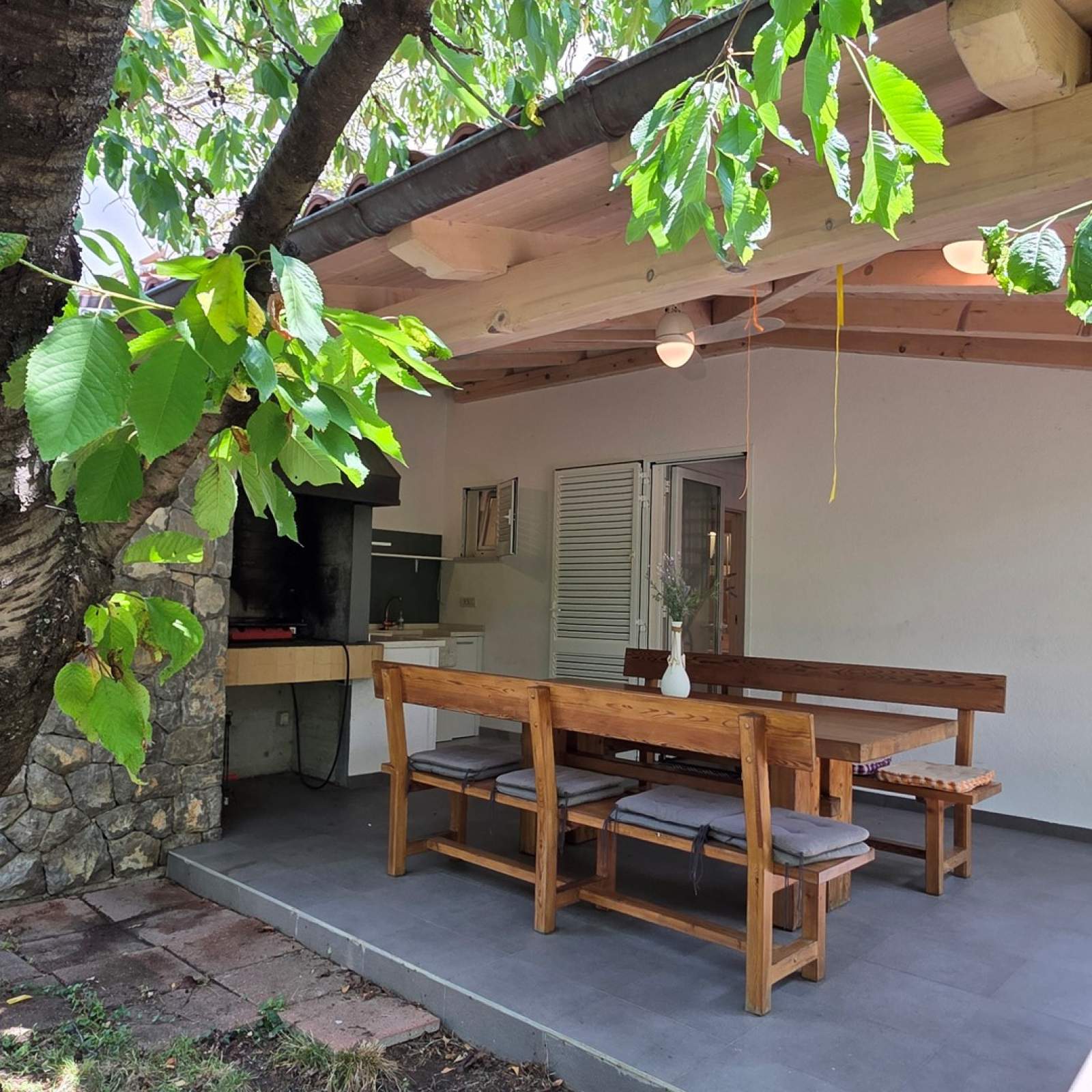 It features two furnished terraces. The larger one (25 m2) includes a dining table, a summer kitchen, and a gas BBQ.